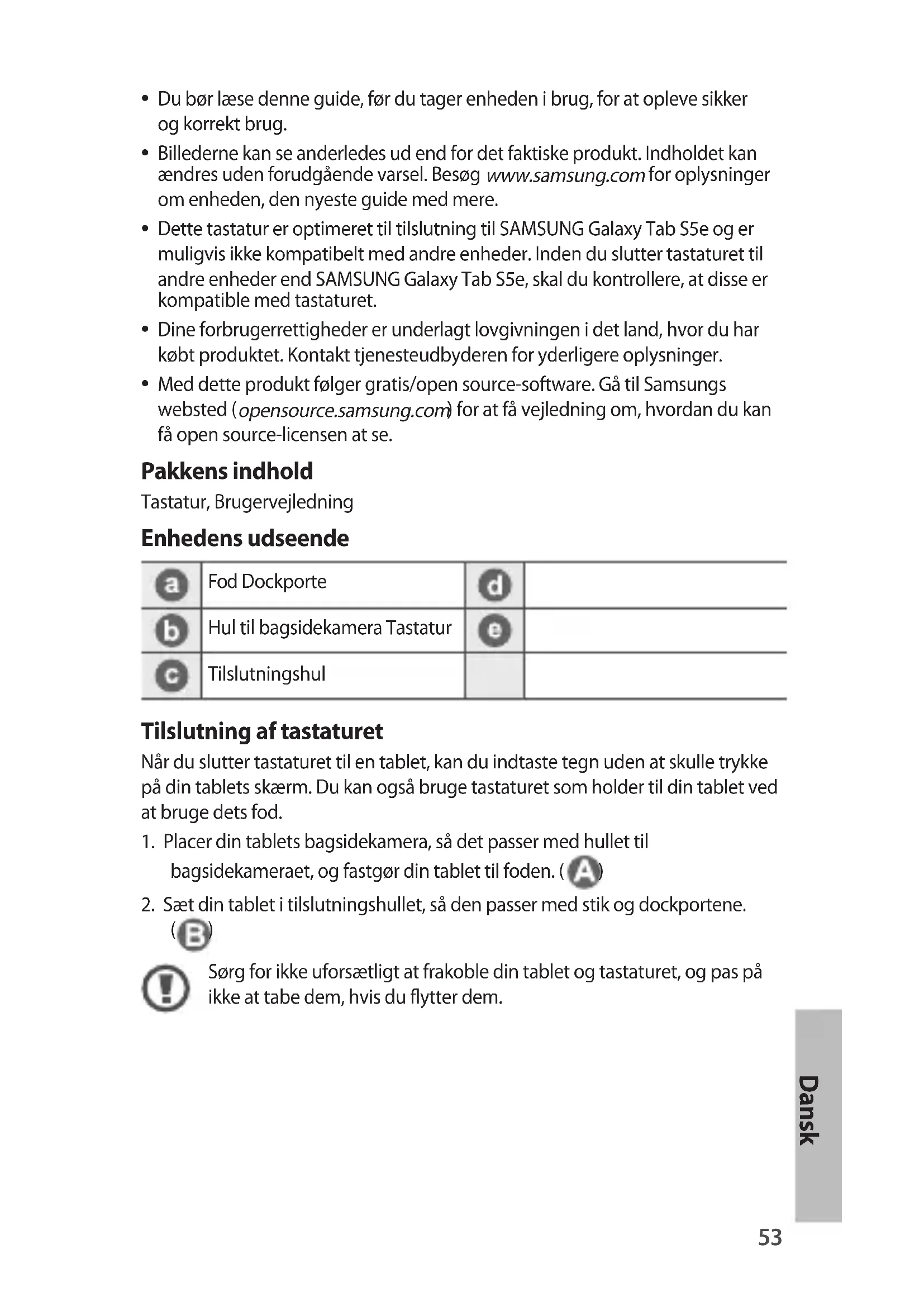 Med dette produkt følger gratis/open source-software. Gå til Samsungs websted ( opensource.samsung.com ) for at få vejledning om, hvordan du kan få open source-licensen at se. Pakkens indhold Tastatur, Brugervejledning Enhedens udseende Fod Dockporte Hul til bagsidekamera Tastatur Tilslutningshul Tilslutning af tastaturet Når du slutter tastaturet til en tablet, kan du indtaste tegn uden at skulle trykke på din tablets skærm. Du kan også bruge tastaturet som holder til din tablet ved at bruge dets fod.
