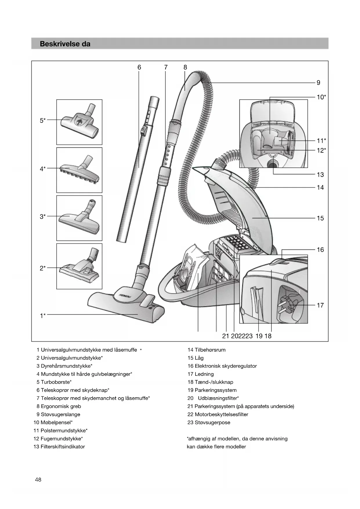 2 Universalgulvmundstykke* 3 Dyrehårsmundstykke* 4 Mundstykke til hårde gulvbelægninger* 5 Turbobørste* 6 Teleskoprør med skydeknap* 7 Teleskoprør med skydemanchet og låsemuffe* 8 Ergonomisk greb 9 Støvsugerslange 10 Møbelpensel* 11 Polstermundstykke* 12 Fugemundstykke* 13 Filterskiftsindikator 14 Tilbehørsrum 15 Låg 16 Elektronisk skyderegulator 17 Ledning 18 Tænd-/slukknap 19 Parkeringssystem