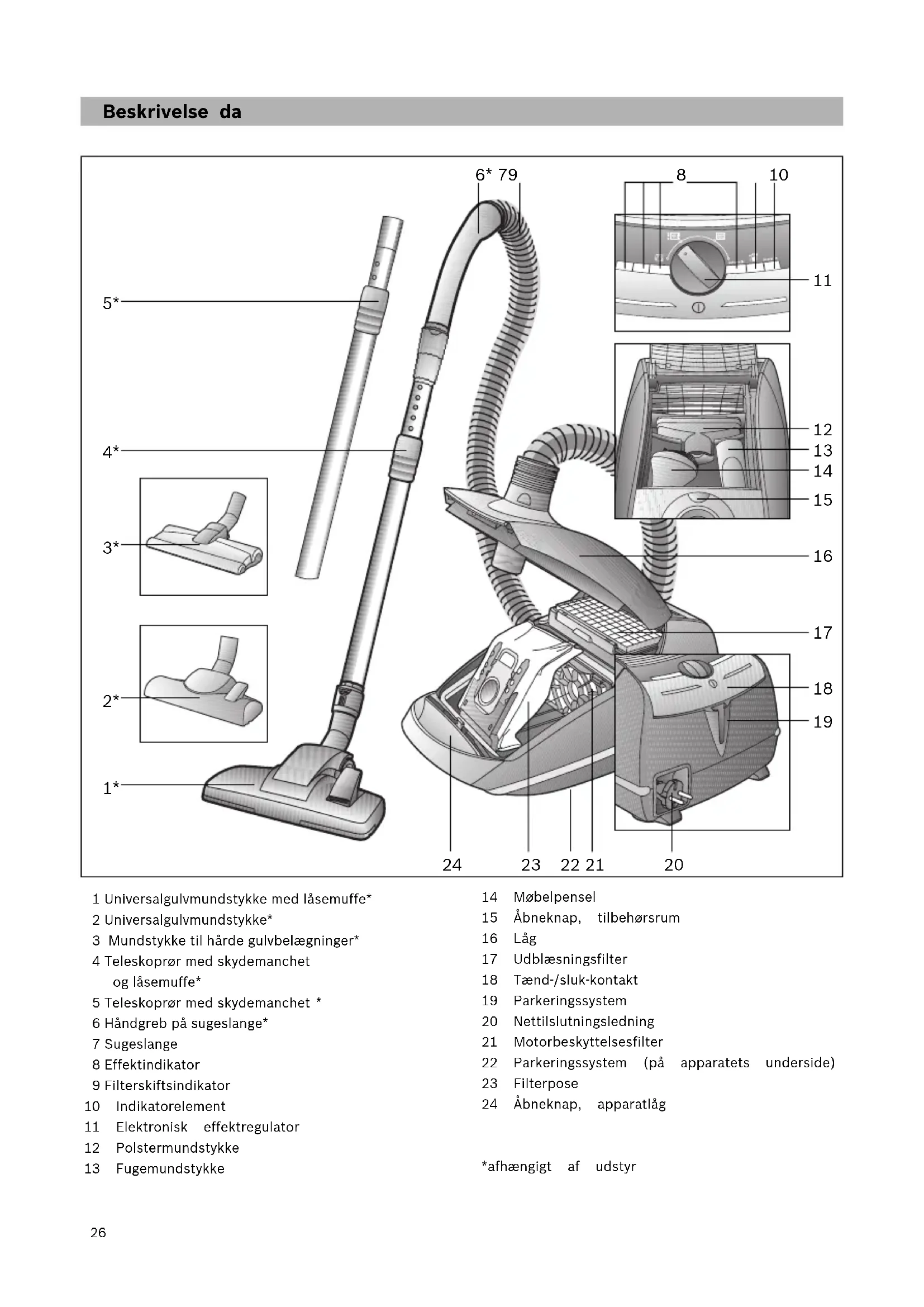 6 Håndgreb på sugeslange* 7 Sugeslange 8 Effektindikator 9 Filterskiftsindikator 10 Indikatorelement 11 Elektronisk effektregulator 12 Polstermundstykke 13 Fugemundstykke 14 Møbelpensel 15 Åbneknap, tilbehørsrum 16 Låg 17 Udblæsningsfilter 18 Tænd-/sluk-kontakt 19 Parkeringssystem 20 Nettilslutningsledning 21 Motorbeskyttelsesfilter 22 Parkeringssystem (på apparatets underside) 23 Filterpose 24 Åbneknap, apparatlåg *afhængigt af udstyr 6* 79