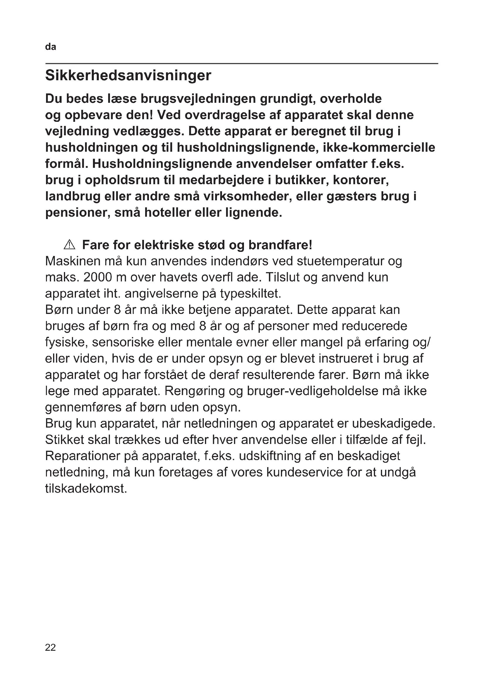 Sikkerhedsanvisninger Du bedes læse brugsvejledningen grundigt, overholde og opbevare den! Ved overdragelse af apparatet skal denne vejledning vedlægges. Dette apparat er beregnet til brug i husholdningen og til husholdningslignende, ikke-kommercielle formål. Husholdningslignende anvendelser omfatter f.eks. brug i opholdsrum til medarbejdere i butikker, kontorer, landbrug eller andre små virksomheder, eller gæsters brug i pensioner, små hoteller eller lignende. A Fare for elektriske stød og brandfare! Maskinen må kun anvendes indendørs ved stuetemperatur og maks. 2000 m over havets over ade. Tilslut og anvend kun apparatet iht. angivelserne på typeskiltet. Børn under 8 år må ikke betjene apparatet. Dette apparat kan bruges af børn fra og med 8 år og af personer med reducerede fysiske, sensoriske eller mentale evner eller mangel på erfaring og/ eller viden, hvis de er under opsyn og er blevet instrueret i brug af apparatet og har forstået de deraf resulterende farer. Børn må ikke lege med apparatet. Rengøring og bruger-vedligeholdelse må ikke gennemføres af børn uden opsyn. Brug kun apparatet, når netledningen og apparatet er ubeskadigede. Stikket skal trækkes ud efter hver anvendelse eller i tilfælde af fejl. Reparationer på apparatet, f.eks. udskiftning af en beskadiget netledning, må kun foretages af vores kundeservice for at undgå tilskadekomst.23