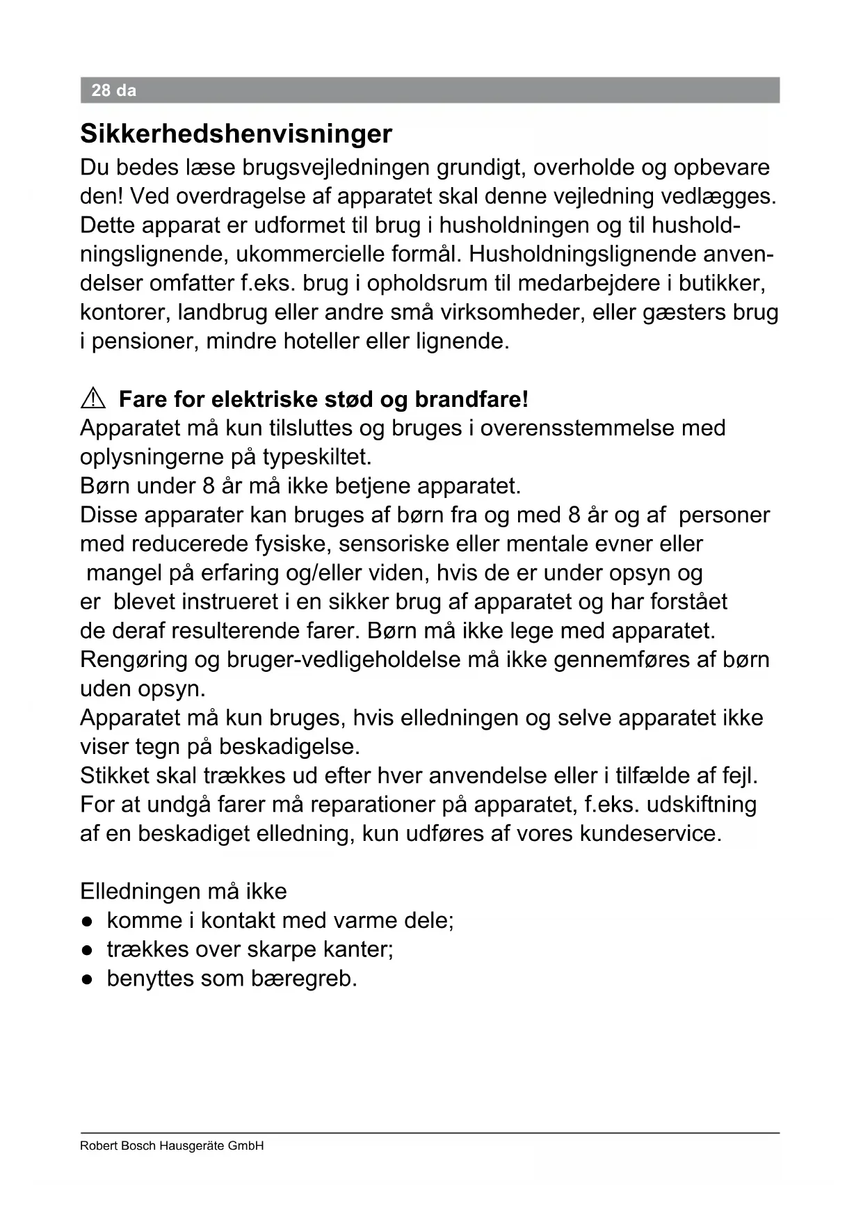 Fare for elektriske stød og brandfare! Apparatet må kun tilsluttes og bruges i overensstemmelse med oplysningerne på typeskiltet. Børn under 8 år må ikke betjene apparatet. Disse apparater kan bruges af børn fra og med 8 år og af personer med reducerede fysiske, sensoriske eller mentale evner eller mangel på erfaring og/eller viden, hvis de er under opsyn og er blevet instrueret i en sikker brug af apparatet og har forstået de deraf resulterende farer. Børn må ikke lege med apparatet. Rengøring og bruger-vedligeholdelse må ikke gennemføres af børn uden opsyn. Apparatet må kun bruges, hvis elledningen og selve apparatet ikke viser tegn på beskadigelse. Stikket skal trækkes ud efter hver anvendelse eller i tilfælde af fejl. For at undgå farer må reparationer på apparatet, f.eks. udskiftning af en beskadiget elledning, kun udføres af vores kundeservice. Elledningen må ikke ● komme i kontakt med varme dele; ● trækkes over skarpe kanter; ● benyttes som bæregreb.29 PHS 9460 02/2013 29da Træk netstikket ud før rengøringen. Sænk aldrig apparatet ned i vand. Brug ikke damprensere. Varmepladerne bliver meget varme. Hold kun apparatet i grebet. Må kun anvendes i tørt hår og ikke i syntetisk hår. Apparatet må kun lægges på varmeufølsomme overader. Må ikke benyttes i nærheden af rindende vand eller vand, der er hældt op i enten håndvask, badekar eller andre beholdere.