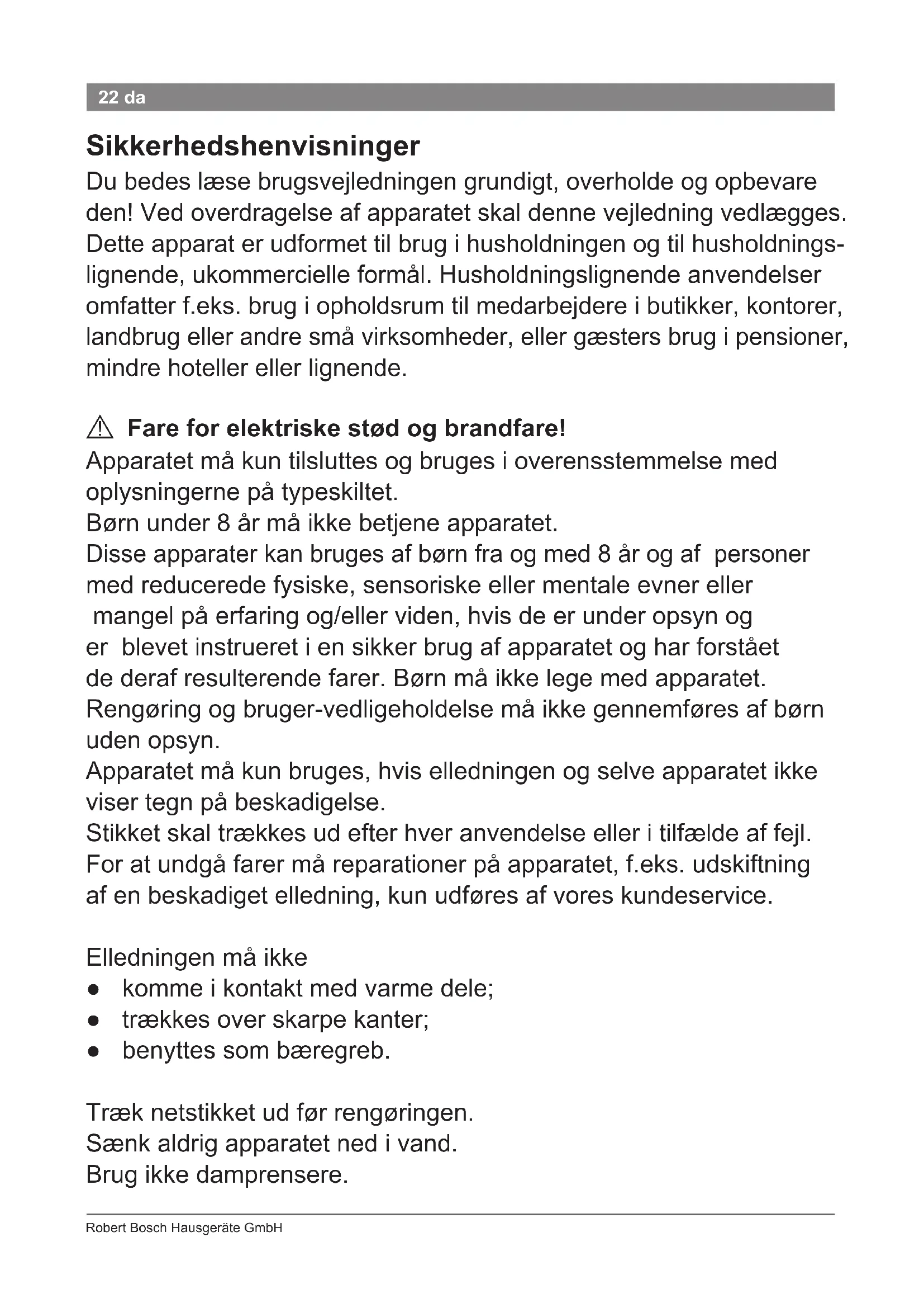 Livsfare! Apparatetmåaldrigkommeikontaktmedvand.Dererogsåfare, nårapparateterslukket;derforskalstikkettrækkesudefterbrugog hvisanvendelsenafbrydes. Foryderligerebeskyttelsesørgerinstallationenafetfejlstrømsrelæ optil30mAihjemmetselinstallation.Elinstallatørenkangiverådog vejledning.