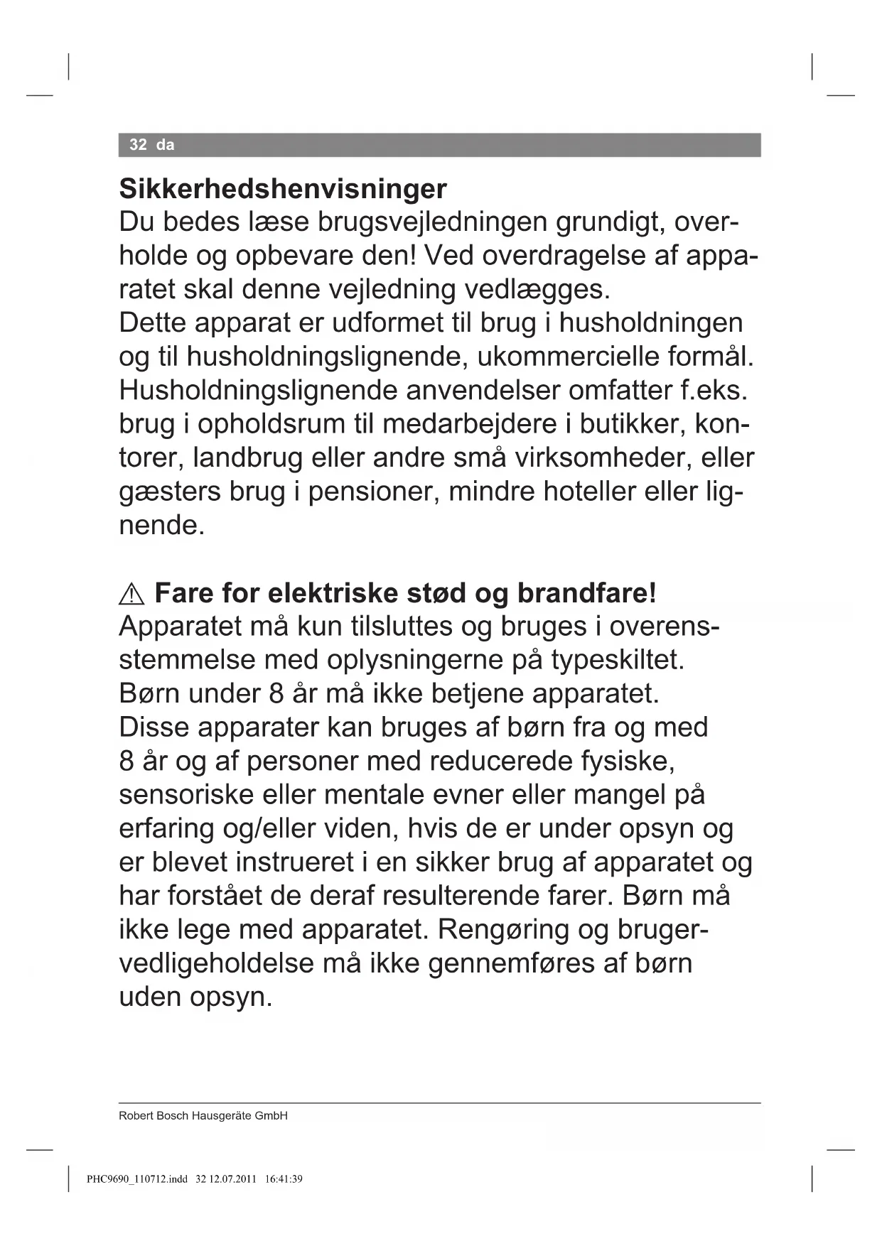 Fareforelektriskestødogbrandfare! Apparatetmåkuntilsluttesogbrugesioverens- stemmelsemedoplysningernepåtypeskiltet. Børnunder8årmåikkebetjeneapparatet. Disseapparaterkanbrugesafbørnfraogmed 8årogafpersonermedreduceredefysiske, sensoriskeellermentaleevnerellermangelpå erfaringog/ellerviden,hvisdeerunderopsynog erblevetinstrueretiensikkerbrugafapparatetog harforståetdederafresulterendefarer.Børnmå ikkelegemedapparatet.Rengøringogbruger- vedligeholdelsemåikkegennemføresafbørn udenopsyn. PHC9690_110712.indd 32 12.07.2011 16:41:39PHC969007/2011 33da Apparatetmåkunbruges,hviselledningenogsel- veapparatetikkevisertegnpåbeskadigelse. Stikketskaltrækkesudefterhveranvendelseeller itilfældeaffejl. Foratundgåfarermåreparationerpåapparatet, f.eks.udskiftningafenbeskadigetelledning,kun udføresafvoreskundeservice. Elledningenmåikke ● kommeikontaktmedvarmedele; ● trækkesoverskarpekanter; ● benyttessombæregreb. Varmeelementetblivervarmt. Holdkunfastiappa- ratetshåndtag. Måkunanvendespåtørthår.Må aldriganvendespåkunstigthår. Måkunlæggespåvarmebestandigtunderlag. Undgåenhverkontaktmedhuden. Måikkebenyttesinærhedenafrindende vandellervand,dererhældtopienten håndvask,badekarellerandre beholdere. PHC9690_110712.indd 33 12.07.2011 16:41:39RobertBoschHausgeräteGmbH 34 da