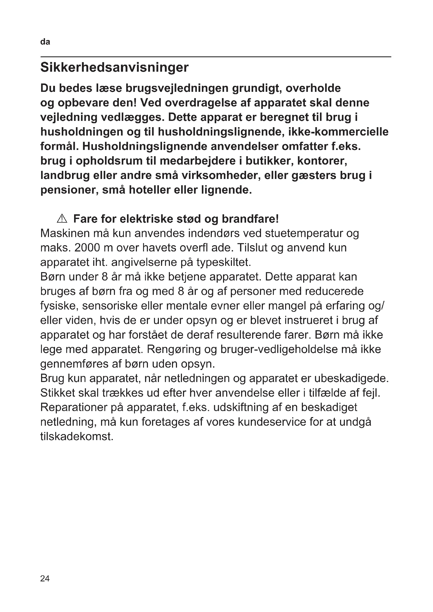 Sikkerhedsanvisninger Du bedes læse brugsvejledningen grundigt, overholde og opbevare den! Ved overdragelse af apparatet skal denne vejledning vedlægges. Dette apparat er beregnet til brug i husholdningen og til husholdningslignende, ikke-kommercielle formål. Husholdningslignende anvendelser omfatter f.eks. brug i opholdsrum til medarbejdere i butikker, kontorer, landbrug eller andre små virksomheder, eller gæsters brug i pensioner, små hoteller eller lignende. A Fare for elektriske stød og brandfare! Maskinen må kun anvendes indendørs ved stuetemperatur og maks. 2000 m over havets over ade. Tilslut og anvend kun apparatet iht. angivelserne på typeskiltet. Børn under 8 år må ikke betjene apparatet. Dette apparat kan bruges af børn fra og med 8 år og af personer med reducerede fysiske, sensoriske eller mentale evner eller mangel på erfaring og/ eller viden, hvis de er under opsyn og er blevet instrueret i brug af apparatet og har forstået de deraf resulterende farer. Børn må ikke lege med apparatet. Rengøring og bruger-vedligeholdelse må ikke gennemføres af børn uden opsyn. Brug kun apparatet, når netledningen og apparatet er ubeskadigede. Stikket skal trækkes ud efter hver anvendelse eller i tilfælde af fejl. Reparationer på apparatet, f.eks. udskiftning af en beskadiget netledning, må kun foretages af vores kundeservice for at undgå tilskadekomst.25