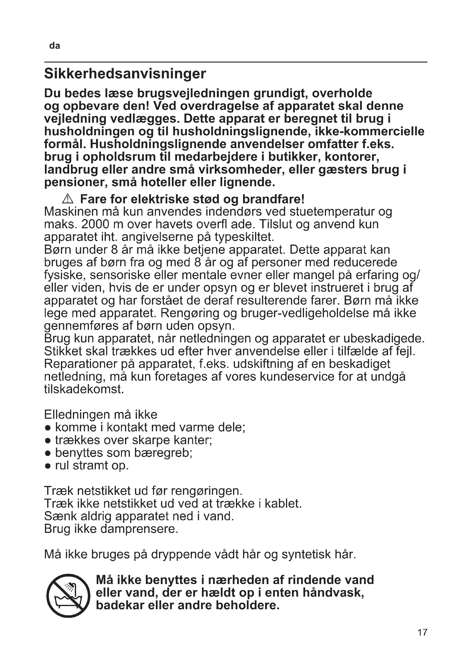 Må ikke benyttes i nærheden af rindende vand eller vand, der er hældt op i enten håndvask, badekar eller andre beholdere.18
