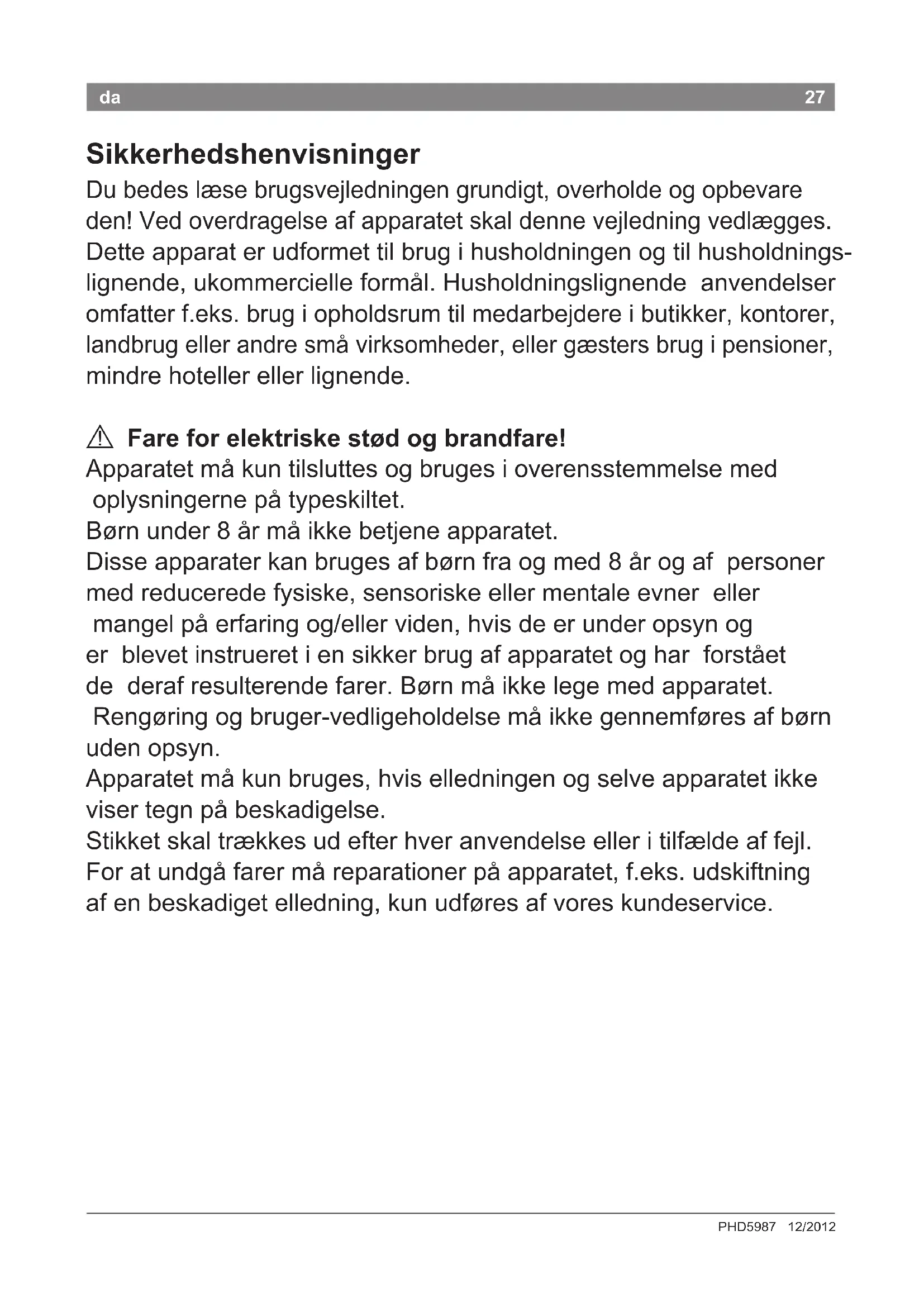 Fare for elektriske stød og brandfare! Apparatet må kun tilsluttes og bruges i overensstemmelse med oplysningerne på typeskiltet. Børn under 8 år må ikke betjene apparatet. Disse apparater kan bruges af børn fra og med 8 år og af personer med reducerede fysiske, sensoriske eller mentale evner eller mangel på erfaring og/eller viden, hvis de er under opsyn og er blevet instrueret i en sikker brug af apparatet og har forstået de deraf resulterende farer. Børn må ikke lege med apparatet. Rengøring og bruger-vedligeholdelse må ikke gennemføres af børn uden opsyn. Apparatet må kun bruges, hvis elledningen og selve apparatet ikke viser tegn på beskadigelse. Stikket skal trækkes ud efter hver anvendelse eller i tilfælde af fejl. For at undgå farer må reparationer på apparatet, f.eks. udskiftning af en beskadiget elledning, kun udføres af vores kundeservice.28 Robert Bosch Hausgeräte GmbH 28 da Elledningen må ikke ● komme i kontakt med varme dele; ● trækkes over skarpe kanter; ● benyttes som bæregreb. Træk netstikket ud før rengøringen. Sænk aldrig apparatet ned i vand. Brug ikke damprensere. Må ikke bruges på dryppende vådt hår og syntetisk hår. Må ikke benyttes i nærheden af rindende vand eller vand, der er hældt op i enten håndvask, badekar eller andre beholdere.