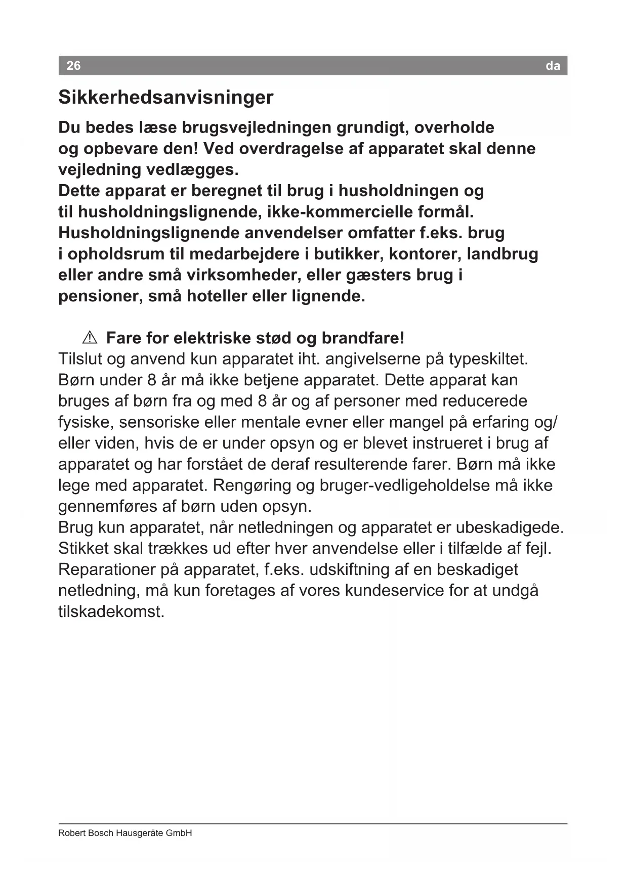 Må ikke benyttes i nærheden af rindende vand eller vand, der er hældt op i enten håndvask, badekar eller andre beholdere. A Livsfare! Apparatet må aldrig komme i kontakt med vand. Der er også fare, når apparatet er slukket; derfor skal stikket trækkes ud efter brug og hvis anvendelsen afbrydes. For yderligere beskyttelse sørger installationen af et fejlstrømsrelæ op til 30 mA i hjemmets elinstallation. Elinstallatøren kan give råd og vejledning. A Kvælningsfare! Lad ikke børn lege med emballagen. A Fare for forbrænding! Stylingdysen og diffuseren kan blive varme, lad dem køle af inden du tager dem af.28 Robert Bosch Hausgeräte GmbH
