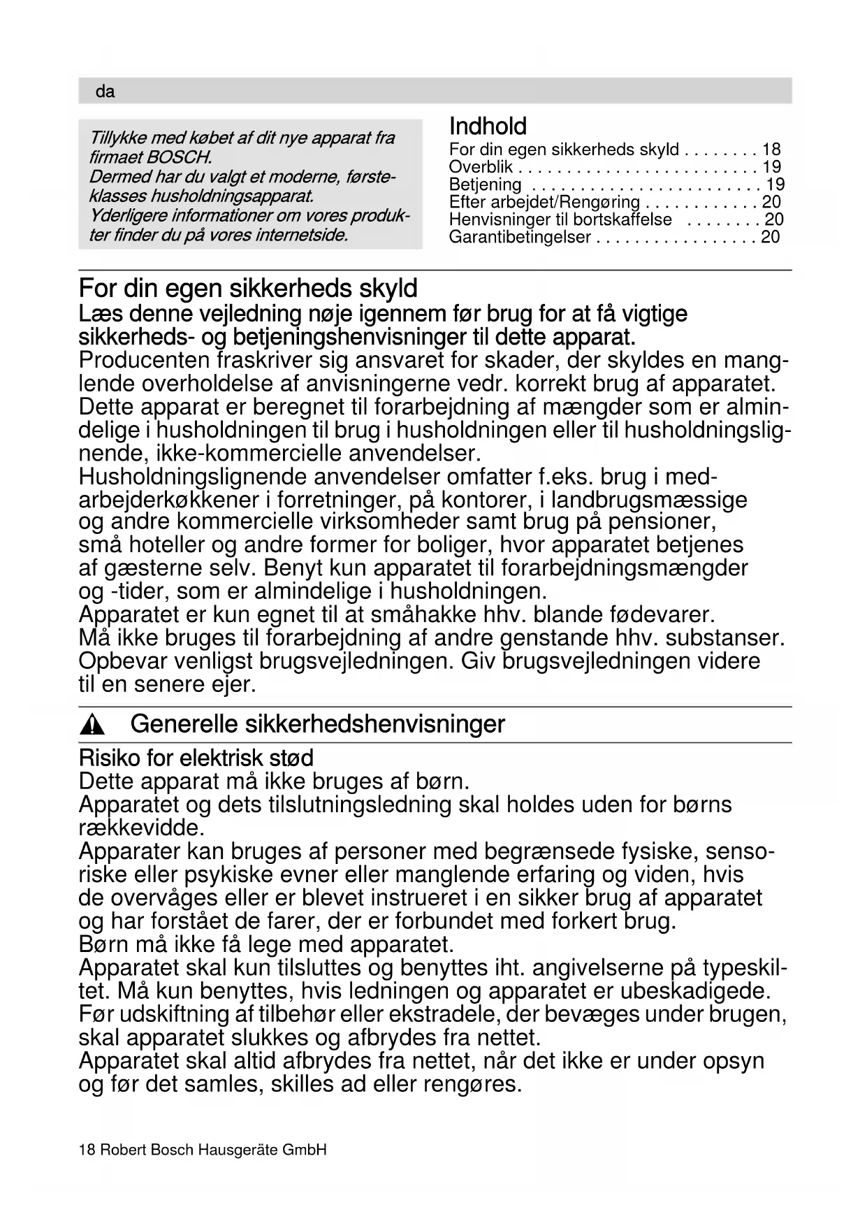 - Garantibetingelser For din egen sikkerheds skyld Læs denne vejledning nøje igennem før brug for at få vigtige sikkerheds- og betjeningshenvisninger til dette apparat. Producenten fraskriver sig ansvaret for skader, der skyldes en mang- lende overholdelse af anvisningerne vedr. korrekt brug af apparatet. Dette apparat er beregnet til forarbejdning af mængder som er almin- delige i husholdningen til brug i husholdningen eller til husholdningslig- nende, ikke-kommercielle anvendelser. Husholdningslignende anvendelser omfatter f.eks. brug i med- arbejderkøkkener i forretninger, på kontorer, i landbrugsmæssige og andre kommercielle virksomheder samt brug på pensioner, små hoteller og andre former for boliger, hvor apparatet betjenes af gæsterne selv. Benyt kun apparatet til forarbejdningsmængder og -tider, som er almindelige i husholdningen. Apparatet er kun egnet til at småhakke hhv. blande fødevarer. Må ikke bruges til forarbejdning af andre genstande hhv. substanser. Opbevar venligst brugsvejledningen. Giv brugsvejledningen videre til en senere ejer. , Generelle sikkerhedshenvisninger Risiko for elektrisk stød Dette apparat må ikke bruges af børn. Apparatet og dets tilslutningsledning skal holdes uden for børns rækkevidde. Apparater kan bruges af personer med begrænsede fysiske, senso- riske eller psykiske evner eller manglende erfaring og viden, hvis de overvåges eller er blevet instrueret i en sikker brug af apparatet og har forstået de farer, der er forbundet med forkert brug. Børn må ikke få lege med apparatet. Apparatet skal kun tilsluttes og benyttes iht. angivelserne på typeskil- tet. Må kun benyttes, hvis ledningen og apparatet er ubeskadigede. Før udskiftning af tilbehør eller ekstradele, der bevæges under brugen, skal apparatet slukkes og afbrydes fra nettet. Apparatet skal altid afbrydes fra nettet, når det ikke er under opsyn og før det samles, skilles ad eller rengøres. p. 20