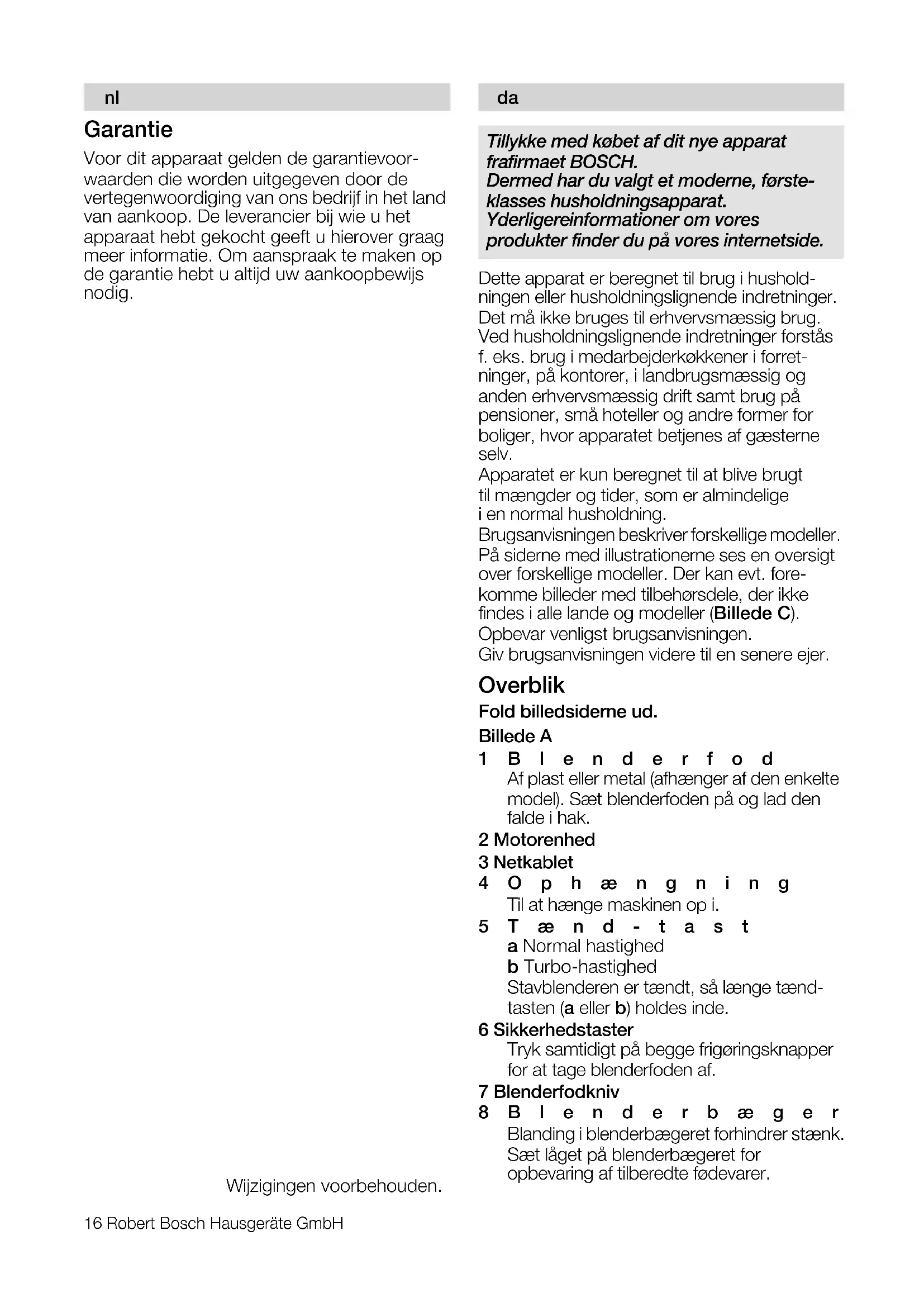 Wijzigingen voorbehouden. q áääóââÉ =ãÉÇ=â›ÄÉí=~Ñ=Çáí=åóÉ=~é é~ê~í= Ñê~ Ñáêã~Éí=_lp`eK aÉêãÉÇ=Ü~ê=Çì=î~äÖí=Éí=ãçÇÉêåÉI=Ñ›êëíÉJ âä~ëëÉë=ÜìëÜçäÇåáåÖë~éé~ê~íK= vÇÉêäáÖÉêÉ áåÑçêã~íáçåÉê=çã=îçêÉë= éêçÇìâíÉê=ÑáåÇÉê=Çì=é™=îçêÉë=á åíÉêåÉíëáÇÉK daRobert Bosch Hausgeräte GmbH 17 9 Minihakker (separat brugsanvisning) Hvis minihakkeren ikke medfølger, kan den bestilles hos kundeservice. Med minihakkeren bruger du apparatets fulde ydelse, når smørepålæg med honning tilberedes (ved overholdelse af opskriften). Opskriften findes i brugsanvisningen til minihakkeren. Sikkerhedsanvisninger hî‹ëíÉäëÉëÑ~ê É oáëáâç=Ñçê=ÉäÉâíêáëâ=ëí›Ç Tilslut og benyt kun apparatet iht. angivelserne på typeskiltet. Må kun tages i brug, hvis ledningen og maskinen er ubeskadigede. Hold børn væk fra maskinen. Hold børn under opsyn for at forhindre, at de leger med maskinen. Personer (også børn) med reduceret fysisk registreringsevne eller psykisk evne eller med manglende erfaring og viden må ikke betjene maskinen, medmindre de er under opsyn eller er blevet instrueret i brugen af maskinen af en person, der er ansvarlig for din sikkerhed. Træk stikket ud før samling, efter brug, før rengøring, før rummet forlades og hvis der opstår fejl. Ledningen må ikke trækkes hen over skarpe kanter eller varme flader. Hvis tilslutningsledningen til dette apparat er beskadiget, skal den udskiftes af fabrikanten, fabrikantens serviceværksted eller lignende, kvalificeret person for at undgå fare. Apparatet må kun repareres af fabrikantens servicepersonale. Hænderne må ikke være fugtige, når der arbejdes med stavblenderen. Benyt ikke stavblenderen i tomgang. Stavblenderen må kun benyttes med originalt tilbehør. Rør varme fødevarer med forsigtighed. Væsken kan sprøjte under arbejdet med apparatet. Dyp ikke apparatet så langt ned i væsken, at forbindelsesstedet mellem blenderfod og motorenhed er dækket af væske. Det anbefales, at maskinen kun er tændt, så længe blenderen er i brug. Stil aldrig blenderfoden på varme overflader eller ned i varme fødevarer. Lad varme fødevarer afkøle til mindst 80 °C, før de blandes med blenderen! hî‹ëíÉäëÉëÑ~êÉ=ëçã=Ñ›äÖÉ=~Ñ=ëâ~êéÉ= âåáîÉLêçíÉêÉåÇÉ=ÇêÉî píáâ=~äÇêáÖ=Ü™åÇÉå=áåÇ=á=âåáîÉå=á=ÄäÉåÇÉêÑçÇÉåK= oÉåÖ›ê=~äÇêáÖ=ÄäÉåÇÉêÑçÇâåáîÉå=ãÉÇ=ÇÉ=Ä~êÉ= ÑáåÖêÉK=_Éåóí=~äíáÇ=Éå=Ä›êëíÉI=å™ê=ÇÉ=ëâ~ä= êÉåÖ›êÉëK sáÖíáÖí> _äÉåÇÉêÑçÇÉå=ã™=âìå=í~ÖÉë=~Ñ=çÖ=ë‹ííÉë=é™I= å™ê=~éé~ê~íÉí=ëí™ê=ëíáääÉK Betjening Blenderen er beregnet til at fremstille mayon- naise, sovs, blandede drinks, babymad, kogt frugt og grønt. Til purering af supper. Til finhakning/hakning af rå fødevarer (løg, hvidløg, krydderurter) i minihakkeren! Stavblenderen er ikke beregnet til at lave kartoffelmos. Rengør alle dele, før de tages i brug første gang. Billede B Træk hele ledningen ud. Klik blenderfoden sammen med motoren- heden og tryk den rigtigt fast. Sæt stikket i. Kom fødevarerne i blenderbægeret eller i et andet højt bæger. Stavblenderen fungerer bedre, hvis det, der skal blendes, er flydende. Hold fast i stavblender og bæger. Tænd for stavblenderen ved at trykke på den ønskede tændetaste (Normal/Turbo- hastighed). Normalt anbefales det at anvende turbo- hastigheden til hakning af fødevarer. Brug den normale hastighed til væsker og varme fødevarer. Stavblenderen er tændt, så længe tænd- tasten holdes inde. For at undgå stænk og sprøjt: Tryk først på starttasten, når blenderfoden er dykket ned i fødevarerne. Stavblenderen skal altid være slukket, før den tages op af de blendede fødevarer. Slip tændetasten, når blendningen er færdig. Træk stikket ud. Tryk på sikkerhedstasterne og tag blenderfoden af grundmodellen. da18 Robert Bosch Hausgeräte GmbH Efter arbejdet/rengøring m~ë=é™> aóé=~äÇêáÖ=ãçíçêÉåÜÉÇÉå=á=î~åÇ=çÖ=ë‹í=ÇÉå= ~äÇêáÖ=á=çéî~ëâÉã~ëâáåÉåK ^åîÉåÇ=áââÉ=åçÖÉå=Ç~ãéêÉåëÉê> lîÉêÑä~ÇÉêåÉ=â~å=ÄÉëâ~ÇáÖÉëK=_Éåóí=áåÖÉå= ëâìêÉåÇÉ=êÉåÖ›êáåÖëãáÇäÉêK Træk stikket ud! Tør motorenheden af først med en fugtig klud og herefter med en tør klud. Bægeret kan tåle opvaskemaskine. Sæt blenderfoden i opvaskemaskinen eller rengør den under rindende vand. Blenderfoden skal stå ret op (med blender- fodkniven opad) under tørringen, så evt. vand i foden kan løbe ud. Ved rivning af f.eks. rødkål og gulerødder opstår der en rød belægning, som fjernes med et par dråber spiseolie eller citronsaft. Opskrifter og tips Mayonnaise 1 æg (æggeblomme og æggehvide) 1 spsk sennep 1 spsk citronsaft eller eddike 200–250 ml olie Salt og peber efter smag Det er vigtigt, at ingredienserne har samme temperatur! Kom ingredienserne i bægeret. Stil stavblenderen på bunden af bægeret og rør ingredienserne sammen, til blan- dingen begynder at samle sig. Løft den tændte stavblender langsomt op til den øverste kant af blandingen og sænk den igen, til mayonnaisen er færdig. Tip: Denne opskrift kan kun bruges til at frem- stille majonnaise med æggeblommer. Brug her kun den halve mængde olie. Grøntsagssuppe 300 g kartofler 200 g gulerødder 1 lille stykke selleri 2 tomater 1 løg 50 g smør 2 l vand Salt og peber efter smag Fjern skræl og kerne fra tomaterne. Skær de rengjorte og vaskede grøntsager i stykker og brun dem i varmt smør. Tilsæt vand og salt. Lad det hale koge i 20–25 min. Tag gryden af komfuret/kogepladen. Purér suppen i gryden med stavblenderen. Tilsæt salt og peber efter behag. Pandekagedej 250 ml mælk 1 æg 100 g mel 25 g smeltet, af