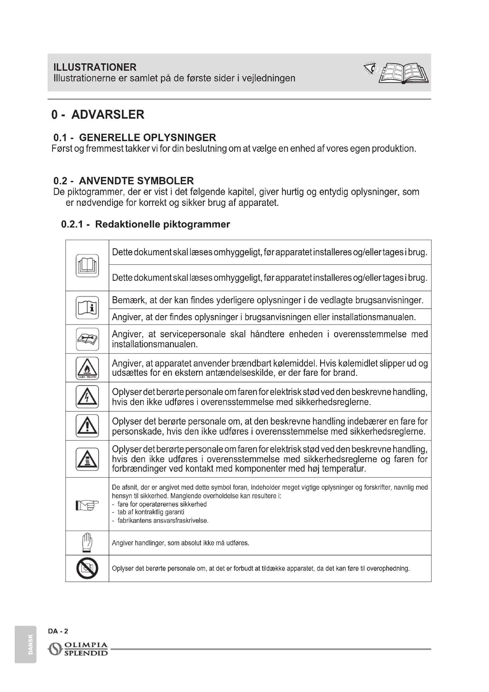 Dette dokument skal læses omhyggeligt, før apparatet installeres og/eller tages i brug. Dette dokument skal læses omhyggeligt, før apparatet installeres og/eller tages i brug. Bemærk, at der kan ndes yderligere oplysninger i de vedlagte brugsanvisninger. Angiver, at der ndes oplysninger i brugsanvisningen eller installationsmanualen. Angiver, at servicepersonale skal håndtere enheden i overensstemmelse med installationsmanualen. Angiver, at apparatet anvender brændbart kølemiddel. Hvis kølemidlet slipper ud og udsættes for en ekstern antændelseskilde, er der fare for brand. Oplyser det berørte personale om faren for elektrisk stød ved den beskrevne handling, hvis den ikke udføres i overensstemmelse med sikkerhedsreglerne. Oplyser det berørte personale om, at den beskrevne handling indebærer en fare for personskade, hvis den ikke udføres i overensstemmelse med sikkerhedsreglerne. Oplyser det berørte personale om faren for elektrisk stød ved den beskrevne handling, hvis den ikke udføres i overensstemmelse med sikkerhedsreglerne og faren for forbrændinger ved kontakt med komponenter med høj temperatur. De afsnit, der er angivet med dette symbol foran, indeholder meget vigtige oplysninger og forskrifter, navnlig med hensyn til sikkerhed. Manglende overholdelse kan resultere i:- fare for operatørernes sikkerhed- tab af kontraktlig garanti- fabrikantens ansvarsfraskrivelse.Angiver handlinger, som absolut ikke må udføres.Oplyser det berørte personale om, at det er forbudt at tildække apparatet, da det kan føre til overophedning. ILLUSTRATIONER Illustrationerne er samlet på de første sider i vejledningenDOLCECLIMA AIR PRO DA - 3 DANSK