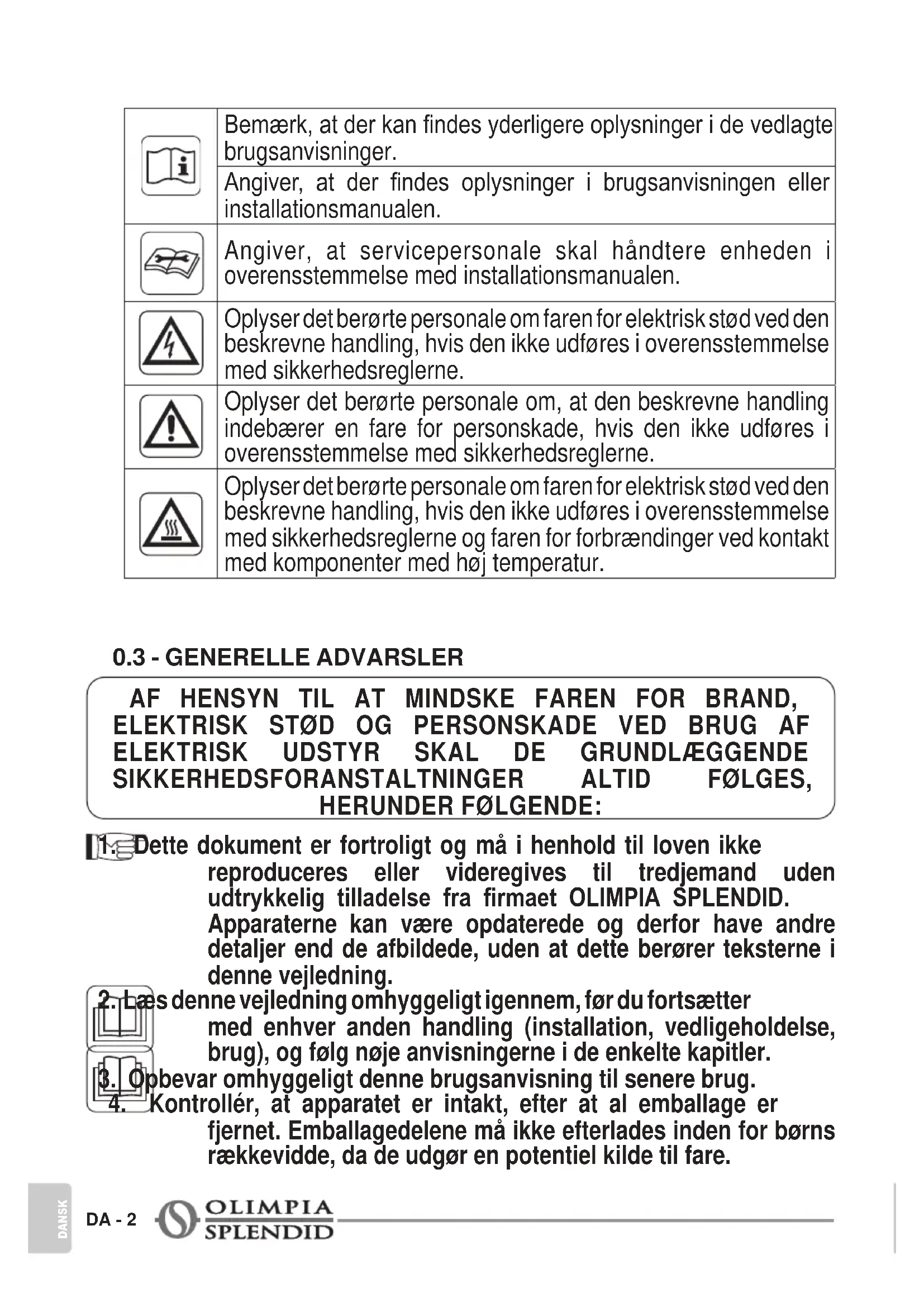 reproduceres eller videregives til tredjemand uden udtrykkelig tilladelse fra rmaet OLIMPIA SPLENDID. Apparaterne kan være opdaterede og derfor have andre detaljer end de afbildede, uden at dette berører teksterne i denne vejledning.