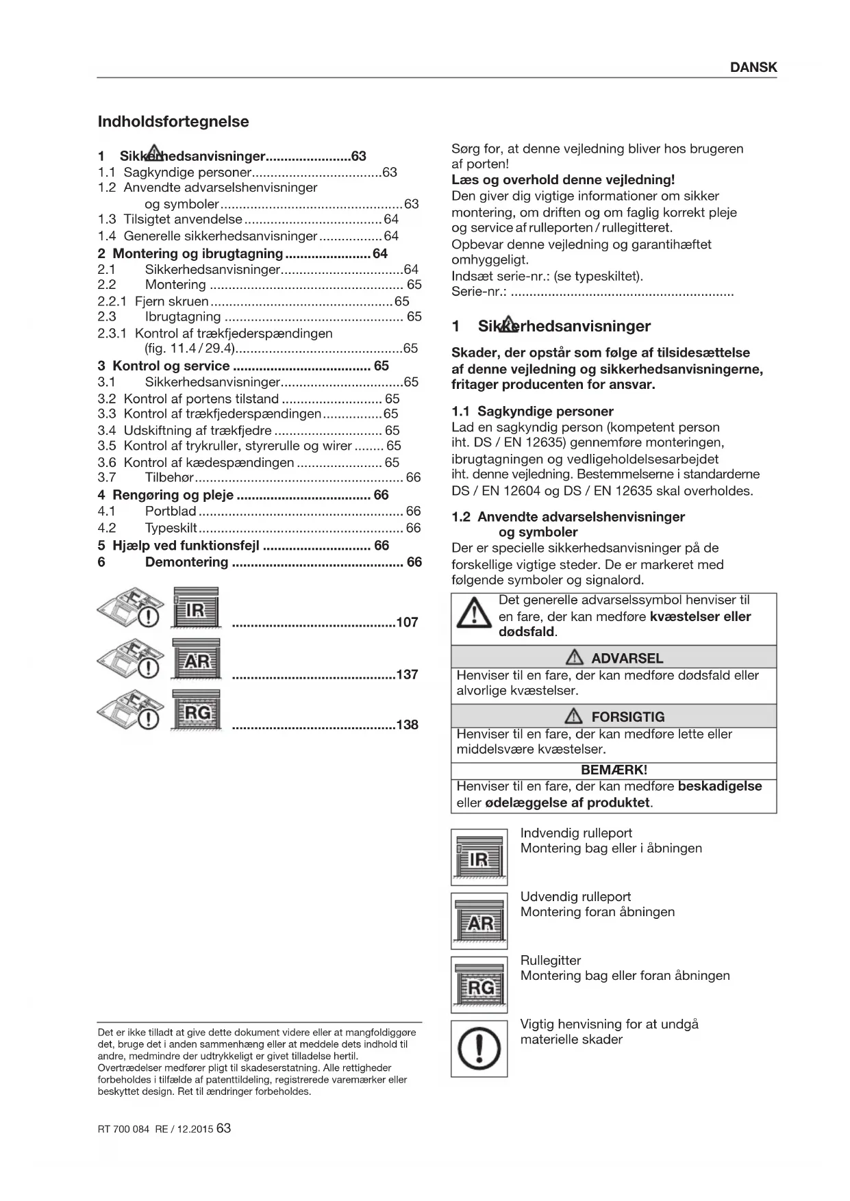 ogsymboler Der er specielle sikkerhedsanvisninger på de forskellige vigtige steder. De er markeret med følgende symboler og signalord. Det generelle advarselssymbol henviser til enfare, der kan medføre kvæstelser eller dødsfald. ADVARSEL Henviser til en fare, der kan medføre dødsfald eller alvorlige kvæstelser. FORSIGTIG Henviser til en fare, der kan medføre lette eller middelsvære kvæstelser. BEMÆRK! Henviser til en fare, der kan medføre beskadigelse eller ødelæggelse af produktet. Indvendig rulleport Montering bag eller i åbningen Udvendig rulleport Montering foran åbningen Rullegitter Montering bag eller foran åbningen Vigtig henvisning for at undgå materielleskader Det er ikke tilladt at give dette dokument videre eller at mangfoldiggøre det, bruge det i anden sammenhæng eller at meddele dets indhold til andre, medmindre der udtrykkeligt er givet tilladelse hertil. Overtrædelser medfører pligt til skadeserstatning. Alle rettigheder forbeholdes i tilfælde af patenttildeling, registrerede varemærker eller beskyttet design. Ret til ændringer forbeholdes.