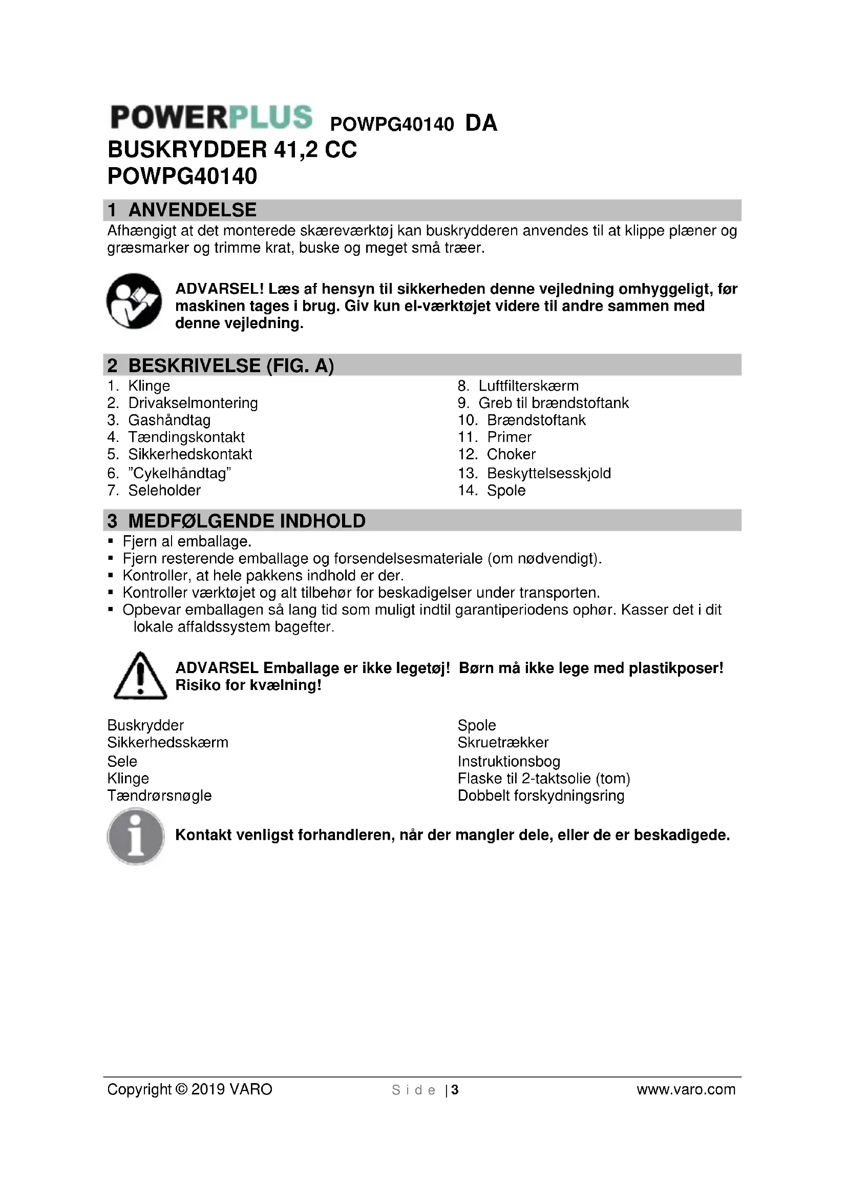 Copyright © 2019 VARO S i d e | 3 www.varo.com BUSKRYDDER 41,2 CC POWPG40140 1 ANVENDELSE Afhængigt at det monterede skæreværktøj kan buskrydderen anvendes til at klippe plæner og græsmarker og trimme krat, buske og meget små træer. ADVARSEL! Læs af hensyn til sikkerheden denne vejledning omhyggeligt, før maskinen tages i brug. Giv kun el-værktøjet videre til andre sammen med denne vejledning. 2 BESKRIVELSE (FIG. A)