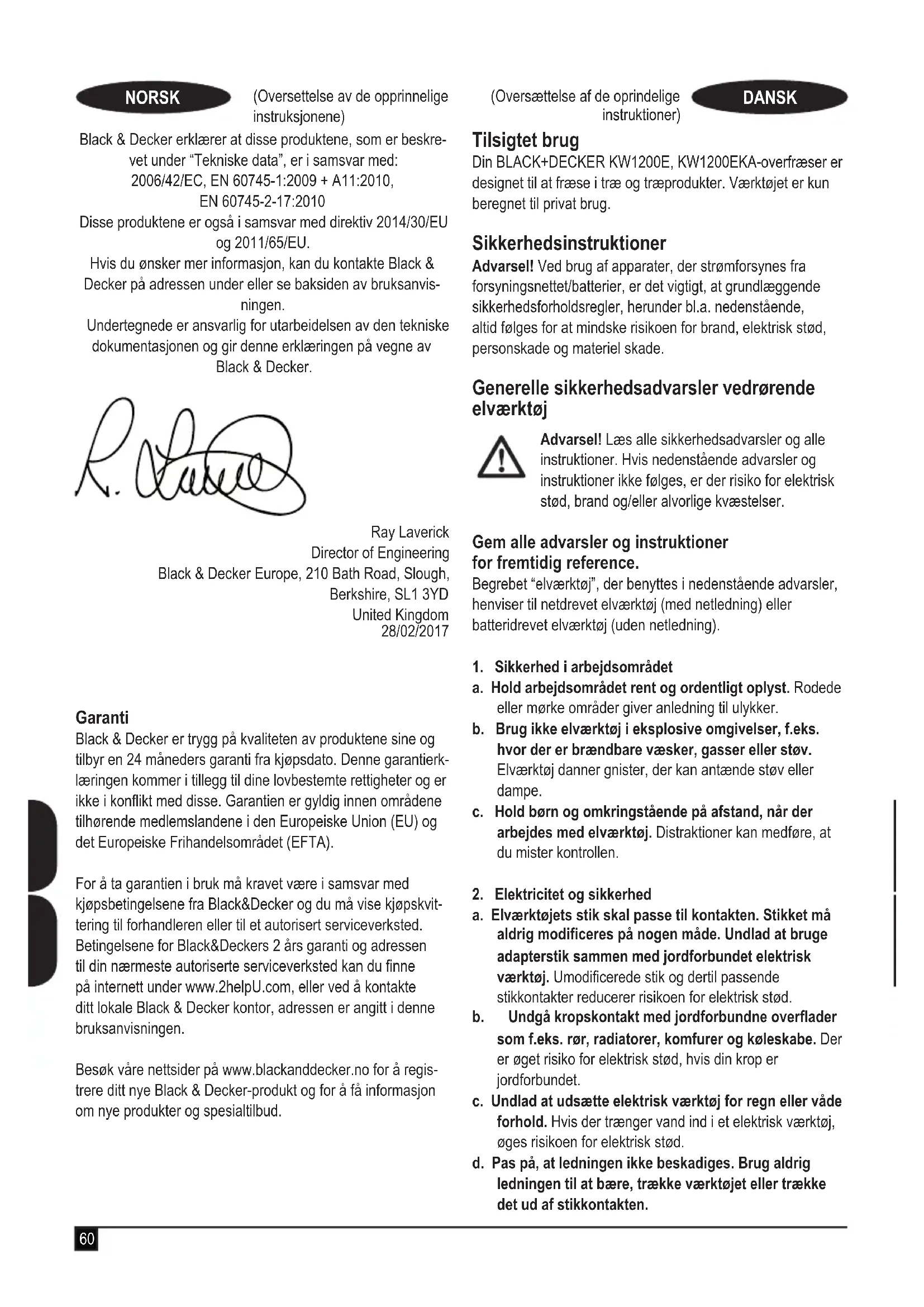Kontakt Black & Decker på nedenstående adresse eller sevejledningens bagside for at få yderligere oplysninger. Undertegnede er ansvarlig for udarbejdelsen af de tekniske data og fremsætter dette erklæring på vegne af Black & Decker.