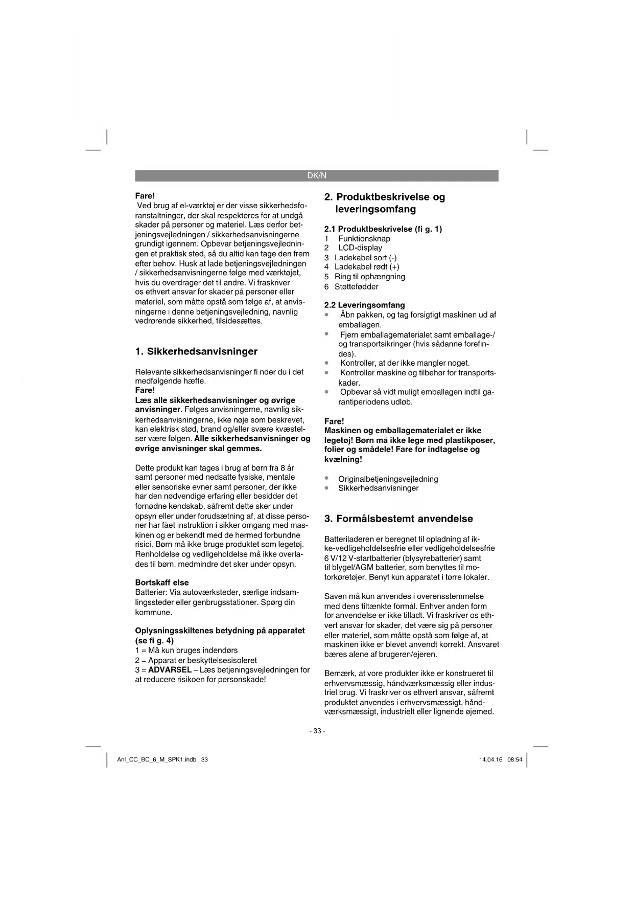 Batteriladeren er beregnet til opladning af ik- ke-vedligeholdelsesfrie eller vedligeholdelsesfrie 6 V/12 V-startbatterier (blysyrebatterier) samt til blygel/AGM batterier, som benyttes til mo- torkøretøjer. Benyt kun apparatet i tørre lokaler. Saven må kun anvendes i overensstemmelse med dens tiltænkte formål. Enhver anden form for anvendelse er ikke tilladt. Vi fraskriver os eth- vert ansvar for skader, det være sig på personer eller materiel, som måtte opstå som følge af, at maskinen ikke er blevet anvendt korrekt. Ansvaret bæres alene af brugeren/ejeren. Bemærk, at vore produkter ikke er konstrueret til erhvervsmæssig, håndværksmæssig eller indus- triel brug. Vi fraskriver os ethvert ansvar, såfremt produktet anvendes i erhvervsmæssigt, hånd- værksmæssigt, industrielt eller lignende øjemed. Anl_CC_BC_6_M_SPK1.indb 33Anl_CC_BC_6_M_SPK1.indb 33 14.04.16 08:5414.04.16 08:54DK/N