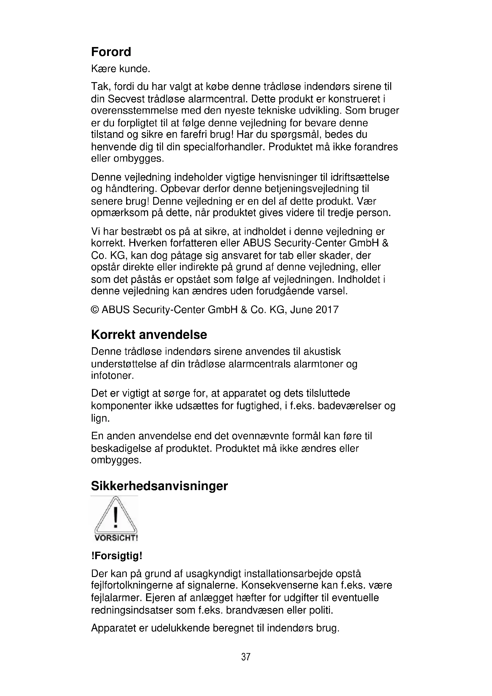 Forord Kære kunde. Tak, fordi du har valgt at købe denne trådløse indendørs sirene til din Secvest trådløse alarmcentral. Dette produkt er konstrueret i overensstemmelse med den nyeste tekniske udvikling. Som bruger er du forpligtet til at følge denne vejledning for bevare denne tilstand og sikre en farefri brug! Har du spørgsmål, bedes du henvende dig til din specialforhandler. Produktet må ikke forandres eller ombygges. Denne vejledning indeholder vigtige henvisninger til idriftsættelse og håndtering. Opbevar derfor denne betjeningsvejledning til senere brug! Denne vejledning er en del af dette produkt. Vær opmærksom på dette, når produktet gives videre til tredje person. Vi har bestræbt os på at sikre, at indholdet i denne vejledning er korrekt. Hverken forfatteren eller ABUS Security-Center GmbH & Co. KG, kan dog påtage sig ansvaret for tab eller skader, der opstår direkte eller indirekte på grund af denne vejledning, eller som det påstås er opstået som følge af vejledningen. Indholdet i denne vejledning kan ændres uden forudgående varsel. © ABUS Security-Center GmbH & Co. KG, June 2017 Korrekt anvendelse Denne trådløse indendørs sirene anvendes til akustisk understøttelse af din trådløse alarmcentrals alarmtoner og infotoner. Det er vigtigt at sørge for, at apparatet og dets tilsluttede komponenter ikke udsættes for fugtighed, i f.eks. badeværelser og lign. En anden anvendelse end det ovennævnte formål kan føre til beskadigelse af produktet. Produktet må ikke ændres eller ombygges. Sikkerhedsanvisninger !Forsigtig! Der kan på grund af usagkyndigt installationsarbejde opstå fejlfortolkningerne af signalerne. Konsekvenserne kan f.eks. være fejlalarmer. Ejeren af anlægget hæfter for udgifter til eventuelle redningsindsatser som f.eks. brandvæsen eller politi. Apparatet er udelukkende beregnet til indendørs brug.38 Overhold anvisningerne og henvisningerne i denne vejledning! Hvis du ikke overholder denne vejledning, bortfalder dit garantikrav! En anden anvendelse end det formål kan føre til beskadigelse af produktet. Den elektroniske del af produktet må ikke forandres eller ombygges. For følgeskader påtager vi os intet ansvar! !Batteriadvarselshenvisninger! Apparatet forsynes med jævnspænding fra 3 x 1,5 V-monoceller. For at garantere en lang levetid og undgå brande og kvæstelser skal du overholde følgende henvisninger: Batteriet må ikke bortskaffes med husholdningsaffaldet. Batteriet må ikke udsættes direkte for en varmekilde eller solindstråling og må ikke opbevares på et sted med meget høj temperatur. Batteriet må ikke brændes. Batteriet må ikke komme i berøring med vand. Batteriet må ikke skilles ad, stikkes i eller beskadiges. Batterikontakterne må ikke kortsluttes. Batteriet må ikke komme i hænderne på små børn. Batteriet er ikke genopladeligt. Installation Du bør montere sirenen fladt på væggen i en let tilgængelig højde for brugeren. Sørg for, at der findes en egnet spændingsforsyning 12 V DC eller 3 x 1,5 V monocelle D eller begge. Du kan anbringe den indendørs sirene indtil 100 m fra den trådløse alarmcentral. Modtagelsesrækkevidden afhænger kraftigt af bygningens udformning. Kontrol af monteringsstedet Du bør måle styrken af det indgående signal på den planlagte position for den indendørs sirene. Til dette formål kan du benytte den trådløse testboks FU3801 fra vores firma. Undgå følgende monteringssteder: I nærheden af eller på store metalkonstruktioner. Under 1 meters afstand fra strømkabler og metal-, vand- og gasrør. Inde i stålkabinetter. Ved siden af elektroniske apparater, især computere, kopimaskiner eller kommunikationsudstyr. For at montere bundpladen på væggen skal skruen forneden på huset løsnes og den forreste del forsigtigt løftes af bundpladen.39 Set indefra