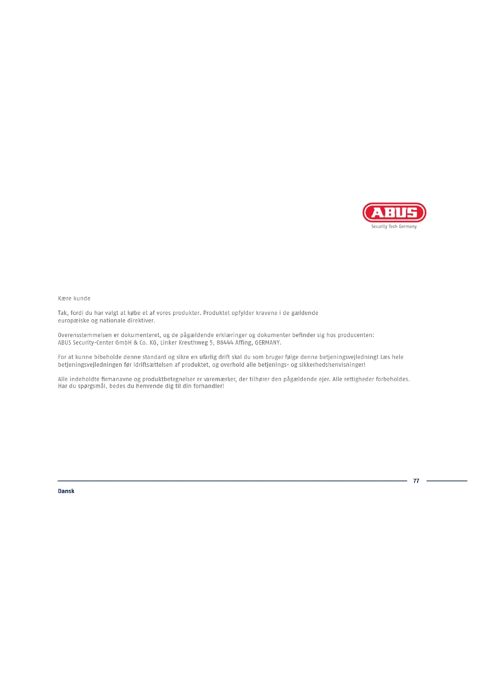Denne kvikguide beskriver de første opsætningstrin for din IP-optager. Detaljerede informationer ndes i den betjeningsvejledning.77 Dansk Kære kunde Tak, fordi du har valgt at købe et af vores produkter. Produktet opfylder kravene i de gældende europæiske og nationale direktiver. Overensstemmelsen er dokumenteret, og de pågældende erklæringer og dokumenter bender sig hos producenten: ABUS Security-Center GmbH & Co. KG, Linker Kreuthweg 5, 86444 Ang, GERMANY. For at kunne bibeholde denne standard og sikre en ufarlig dri skal du som bruger følge denne betjeningsvejledning! Læs hele betjeningsvejledningen før idrisættelsen af produktet, og overhold alle betjenings- og sikkerhedshenvisninger! Alle indeholdte rmanavne og produktbetegnelser er varemærker, der tilhører den pågældende ejer. Alle rettigheder forbeholdes. Har du spørgsmål, bedes du henvende dig til din forhandler!78 Dansk