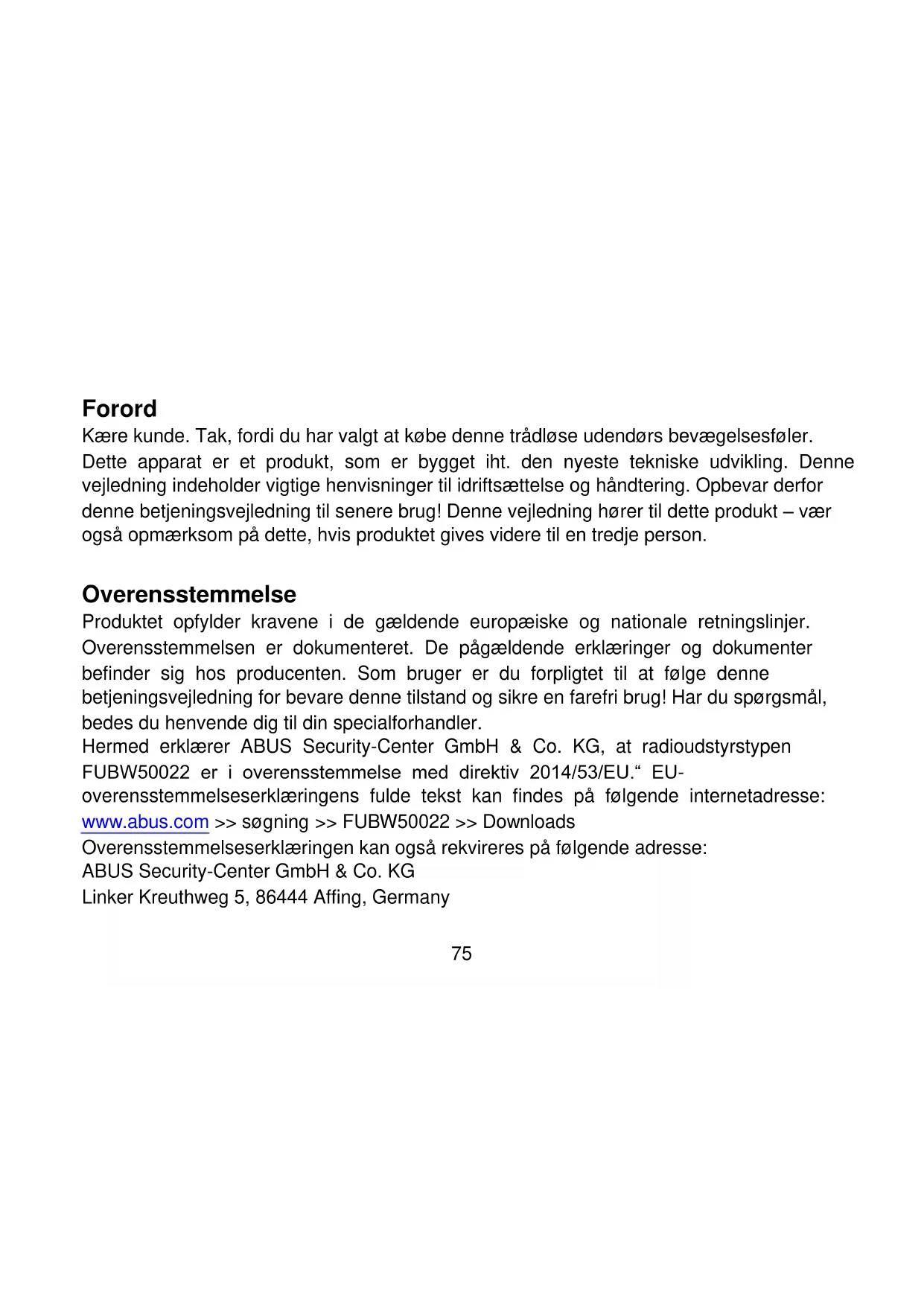 Forord Kære kunde. Tak, fordi du har valgt at købe denne trådløse udendørs bevægelsesføler. Dette apparat er et produkt, som er bygget iht. den nyeste tekniske udvikling. Denne vejledning indeholder vigtige henvisninger til idriftsættelse og håndtering. Opbevar derfor denne betjeningsvejledning til senere brug! Denne vejledning hører til dette produkt – vær også opmærksom på dette, hvis produktet gives videre til en tredje person. Overensstemmelse Produktet opfylder kravene i de gældende europæiske og nationale retningslinjer. Overensstemmelsen er dokumenteret. De pågældende erklæringer og dokumenter befinder sig hos producenten. Som bruger er du forpligtet til at følge denne betjeningsvejledning for bevare denne tilstand og sikre en farefri brug! Har du spørgsmål, bedes du henvende dig til din specialforhandler. Hermed erklærer ABUS Security-Center GmbH & Co. KG, at radioudstyrstypen FUBW50022 er i overensstemmelse med direktiv 2014/53/EU.“ EU- overensstemmelseserklæringens fulde tekst kan findes på følgende internetadresse: www.abus.com >> søgning >> FUBW50022 >> Downloads Overensstemmelseserklæringen kan også rekvireres på følgende adresse: ABUS Security-Center GmbH & Co. KG Linker Kreuthweg 5, 86444 Affing, Germany76 Korrekt anvendelse Overhold anvisningerne og henvisningerne i denne vejledning! Hvis du ikke overholder denne vejledning, bortfalder dit garantikrav! For følgeskader påtager vi os intet ansvar! Produktet må ikke forandres eller ombygges. Vi har bestræbt os på at sikre, at indholdet i denne vejledning er korrekt. Hverken forfatteren eller ABUS Security-Center GmbH & Co. KG har dog ansvar for tab eller skader, der skyldes forkert betjening, ukorrekt brug eller manglende overholdelse af sikkerhedshenvisningerne og advarslerne. Indholdet i denne vejledning kan ændres uden forudgående varsel. Batterihenvisning Apparatet forsynes med 3 V-jævnspænding to 3 V CR123A batterier. For at garantere en lang levetid og undgå brande og kvæstelser skal du overholde følgende henvisninger: Batterierne må ikke bortskaffes med husholdningsaffaldet. Batterierne må ikke udsættes direkte for en varmekilde eller solindstråling og må ikke opbevares på et sted med meget høj temperatur. Batterierne må ikke brændes. Batterierne må ikke komme i berøring med vand. Batterierne må ikke skilles ad, stikkes i eller beskadiges. Batterikontakterne må ikke kortsluttes.77 Batterierne må ikke komme i hænderne på små børn. Batterierne er ikke genopladelige. Bortskaffelse Bortskaffelse iht. direktivet WEEE 2002/96 EF Produktet indeholder værdifulde råstoffer. Bortskaf produktet iht. de gældende lovmæssige bestemmelser, når dets levetid er afsluttet. Produktet samt tilbehør skal indsamles og bortskaffes separat inden for EU. Apparater med dette mærke må ikke bortskaffes sammen med husholdningsaffaldet. Kontakt din forhandler, eller bortskaf produkterne hos den kommunale genbrugsstation for elskrot. Leveringsomfang 1 x trådløs udendørs bevægelsesføler PIR 1 x unbrakonøgle 2 x 3 V CR123/CR17345 lithium-batteri 1 x specialværktøj af kunststof 2 x reserve-klemmefødder til vægafrivningskontakt 1 x betjeningsvejledning 1 x vægadapter til vægafrivningskontakt 2 x blænder (skydeklapper) 1 x mærkat (Long/Medium Beam Mask) 1 x monteringsmateriale inkl. boreskabelon78 Særlige kendetegn Denne trådløse udendørs bevægelsesføler arbejder med to uafhængige, passive infrarøde detektorer, der befinder sig et hus, der er egnet til udendørs anvendelse. Begge følere skal aktiveres, for at detektoren udsender et alarmsignal. Denne yderst præcise og pålidelige føler er designet til anvendelse i alarmsystemer. Impulstælling og registreringens rækkevidde (fra 10 til 30 meter) kan konfigureres. Herudover har føleren en lågsabotage- og vægafrivningskontakt. Føleren kan drejes 180° og hældes 90° inde i huset. Dette giver en mere effektiv udendørs overvågning og en yderst præcis følerregistreringsfunktion. Printkortet er akrylbelagt. Det stødafvisende hus i god kvalitet er lavet af polyethylen og er udstyret med en UV-hærdet, lysgennemtrængelig frontafdækning, der gør føleren vandtæt og beskytter den mod udefra kommende påvirkninger. Kombinationen af præcis elektronik, digitale hvidlysfiltre og en dobbelt afskærmning forhindrer fejlalarmer opstået på grund af sollys eller andre inteferenskilder. Den udendørs bevægelsesfølers design giver en tiltalende, professionel optik – følerens orientering kan i den forbindelse ikke ses.79 Option til vægafrivningskontakt Montering Berør ikke antennen ved monteringen, og bøj den under ingen omstændigheder!