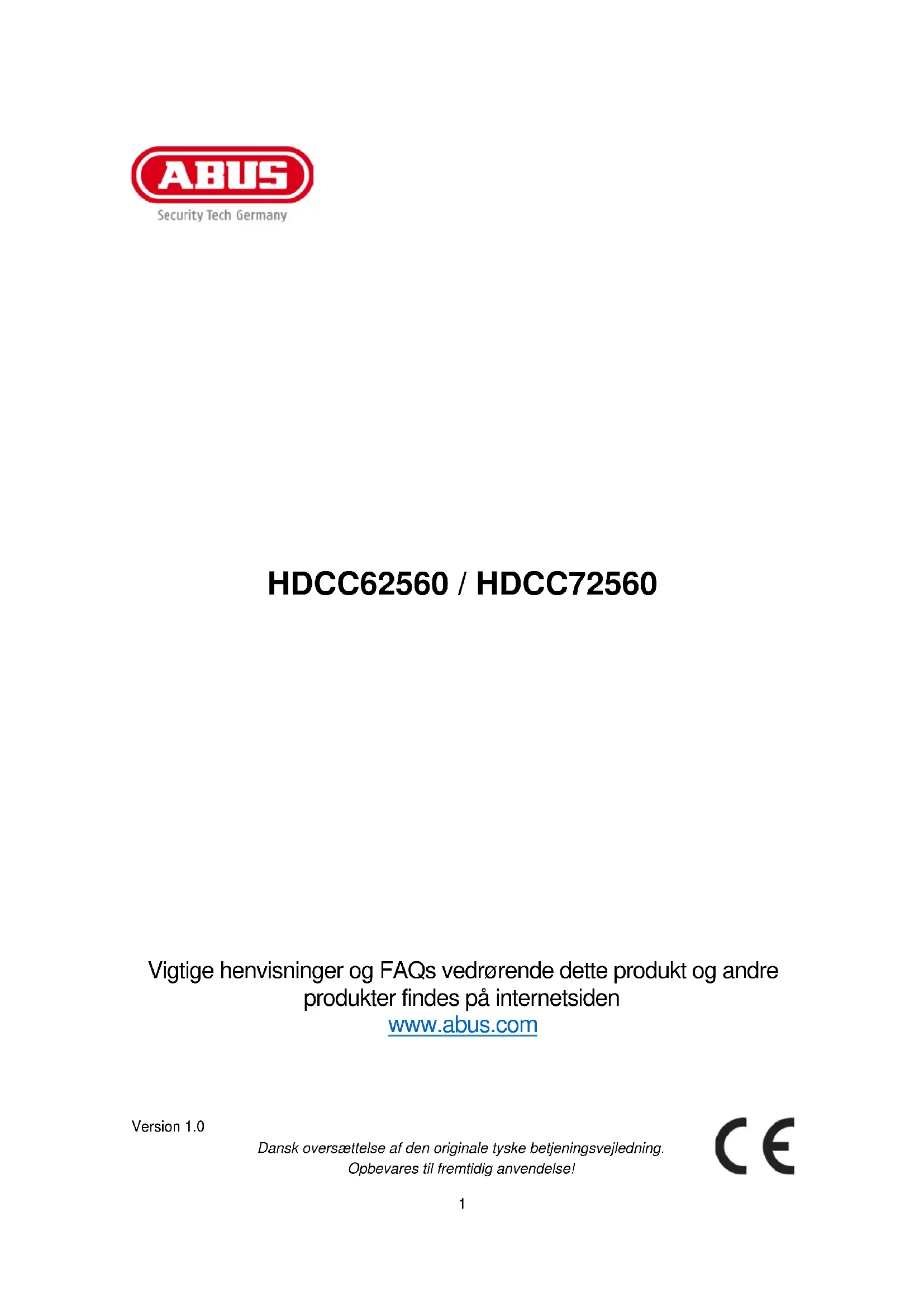 Version 1.0 Dansk oversættelse af den originale tyske betjeningsvejledning. Opbevares til fremtidig anvendelse!2 Dansk Indledning Kære kunde Tak, fordi du har valgt at købe dette produkt. Hermed erklærer ABUS Security-Center, at kameraerne HDCC62560 og HDCC72560 opfylder kravene i følgende EU-direktiver: EMC-direktiv 2014/30/EU samt RoHS-direktiv 2011/65/EU. Den fulde tekst fra EU-overensstemmelseserklæringen findes på følgende internetadresser: www.abus.com/product/HDCC62560 www.abus.com/product/HDCC72560 For at kunne bibeholde denne tilstand og sikre en ufarlig drift skal du som bruger følge denne betjeningsvejledning! Læs hele betjeningsvejledningen igennem før idriftsættelsen af produktet, og overhold alle betjenings- og sikkerhedshenvisninger! Alle indeholdte firmanavne og produktbetegnelser er varemærker, der tilhører den pågældende ejer. Alle rettigheder forbeholdes. I tilfælde af spørgsmål bedes du henvende dig til din installatør eller forhandler!