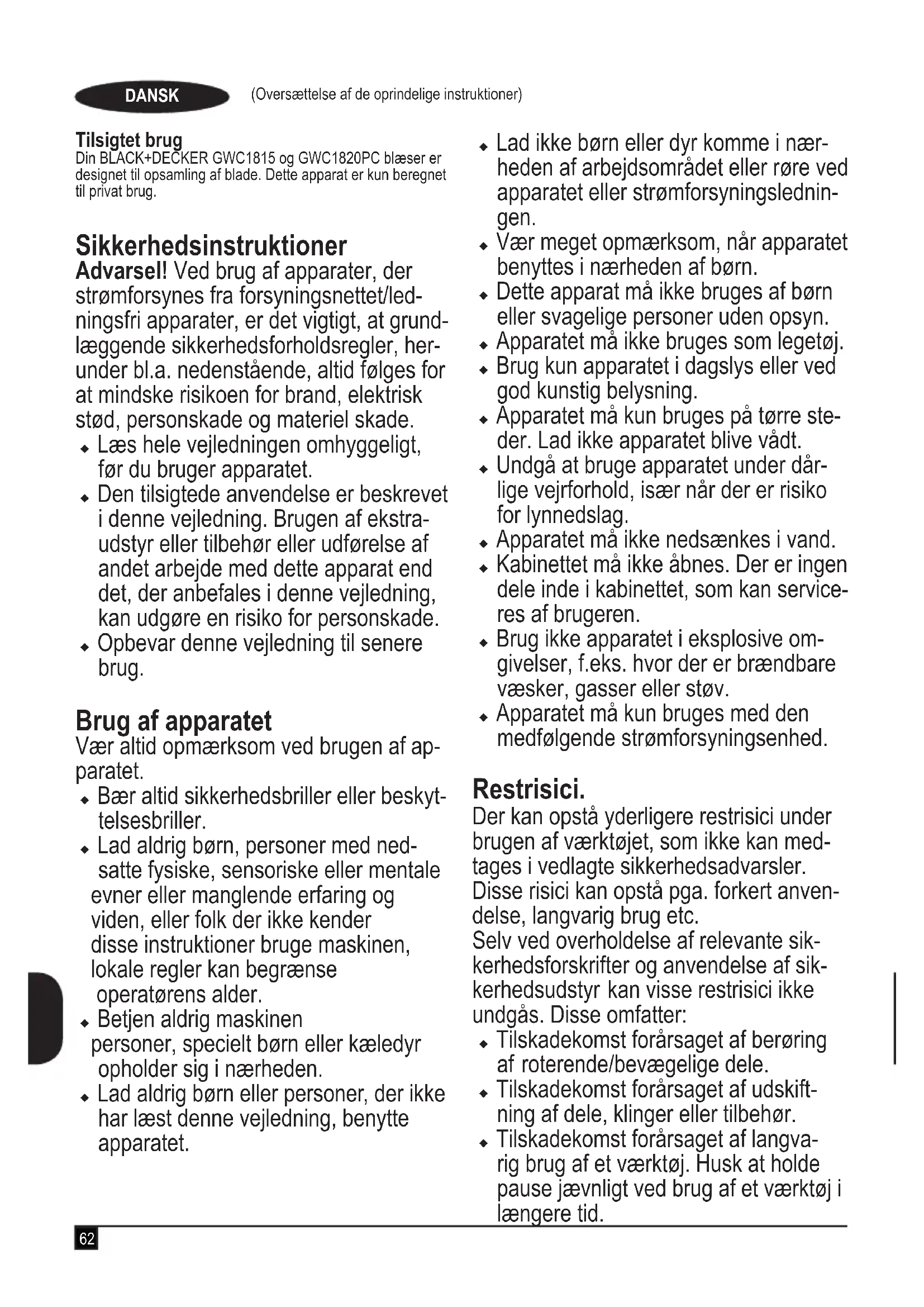 Garanti Black & Decker er trygg på kvaliteten av produktene sine og tilbyr en 24 måneders garanti fra kjøpsdato. Denne garantier- klæringen kommer i tillegg til dine lovbestemte rettigheter og er ikke i konikt med disse. Garantien er gyldig innen område- ne tilhørende medlemslandene i den Europeiske Union (EU) og det Europeiske Frihandelsområdet (EFTA). For å ta garantien i bruk må kravet være i samsvar med kjøpsbetingelsene fra Black&Decker og du må vise kjøpskvit- tering til forhandleren eller til et autorisert serviceverksted. Betingelsene for Black&Deckers 2 års garanti og adressen til din nærmeste autoriserte serviceverksted kan du nne på internett under www.2helpU.com, eller ved å kontakte ditt lokale Black & Decker kontor, adressen er angitt i denne bruksanvisningen. Besøk våre nettsider på www.blackanddecker.no for å regis- trere ditt nye Black & Decker-produkt og for å få informasjon om nye produkter og spesialtilbud.62 (Oversættelse af de oprindelige instruktioner) DANSK Tilsigtet brug Din BLACK+DECKER GWC1815 og GWC1820PC blæser er designet til opsamling af blade. Dette apparat er kun beregnet til privat brug. Sikkerhedsinstruktioner Advarsel! Ved brug af apparater, der strømforsynes fra forsyningsnettet/led- ningsfri apparater, er det vigtigt, at grund- læggende sikkerhedsforholdsregler, her- under bl.a. nedenstående, altid følges for at mindske risikoen for brand, elektrisk stød, personskade og materiel skade. u Læs hele vejledningen omhyggeligt, før du bruger apparatet. u Den tilsigtede anvendelse er beskrevet i denne vejledning. Brugen af ekstra- udstyr eller tilbehør eller udførelse af andet arbejde med dette apparat end det, der anbefales i denne vejledning, kan udgøre en risiko for personskade. u Opbevar denne vejledning til senere brug. Brug af apparatet Vær altid opmærksom ved brugen af ap- paratet. u Bær altid sikkerhedsbriller eller beskyt- telsesbriller. u Lad aldrig børn, personer med ned- satte fysiske, sensoriske eller mentale evner eller manglende erfaring og viden, eller folk der ikke kender disse instruktioner bruge maskinen, lokale regler kan begrænse operatørens alder. u Betjen aldrig maskinen personer, specielt børn eller kæledyr opholder sig i nærheden. u Lad aldrig børn eller personer, der ikke har læst denne vejledning, benytte apparatet. u Lad ikke børn eller dyr komme i nær- heden af arbejdsområdet eller røre ved apparatet eller strømforsyningslednin- gen. u Vær meget opmærksom, når apparatet benyttes i nærheden af børn. u Dette apparat må ikke bruges af børn eller svagelige personer uden opsyn. u Apparatet må ikke bruges som legetøj. u Brug kun apparatet i dagslys eller ved god kunstig belysning. u Apparatet må kun bruges på tørre ste- der. Lad ikke apparatet blive vådt. u Undgå at bruge apparatet under dår- lige vejrforhold, især når der er risiko for lynnedslag. u Apparatet må ikke nedsænkes i vand. u Kabinettet må ikke åbnes. Der er ingen dele inde i kabinettet, som kan service- res af brugeren. u Brug ikke apparatet i eksplosive om- givelser, f.eks. hvor der er brændbare væsker, gasser eller støv. u Apparatet må kun bruges med den medfølgende strømforsyningsenhed. Restrisici. Der kan opstå yderligere restrisici under brugen af værktøjet, som ikke kan med- tages i vedlagte sikkerhedsadvarsler. Disse risici kan opstå pga. forkert anven- delse, langvarig brug etc. Selv ved overholdelse af relevante sik- kerhedsforskrifter og anvendelse af sik- kerhedsudstyr kan visse restrisici ikke undgås. Disse omfatter: u Tilskadekomst forårsaget af berøring af roterende/bevægelige dele. u Tilskadekomst forårsaget af udskift- ning af dele, klinger eller tilbehør. u Tilskadekomst forårsaget af langva- rig brug af et værktøj. Husk at holde pause jævnligt ved brug af et værktøj i længere tid.63 (Oversættelse af de oprindelige instruktioner) DANSK u Hørenedsættelse.u Sundhedsrisici forårsaget af indånding af støv, der genereres ved brug af værktøjet (eksempel: Arbejde med træ, især, eg, bøg og MDF.) Efter brug u Opbevar apparatet på et tørt, godt ventileret sted uden for børns række- vidde, når det ikke er i brug. u Børn må ikke have adgang til opbeva- rede apparater. u Når apparatet opbevares eller trans- porteres i et køretøj, skal det anbrin- ges i bagagerummet eller fastgøres for at forhindre bevægelse som følge af pludselige ændringer i hastighed eller retning. Eftersyn og reparationer u Kontroller apparatet for beskadigede eller defekte dele før brug. Se efter knækkede dele og eventuelle andre forhold, der kan påvirke apparatets funktion. u Brug ikke apparatet med beskadigede eller defekte dele. u Få beskadigede eller defekte dele re- pareret eller udskiftet på et autoriseret værksted. u Forsøg aldrig at fjerne eller udskifte dele ud over dem, der er beskrevet i denne vejledning. Vibration De deklarerede vibrationsemissionsvær- dier angivet i de tekniske data og i overensstemmelseserklæringen er målt i overensstemmelse med en standard testmetode som angivet i EN 50636, og de kan anvendes til at sammenligne et værktøj med et andet. Den deklarerede vibrationsemissions- værdi kan også anvendes i en foreløbig vurdering af eksponeringen. Advarsel! Vibrationsemissionsværdien kan under faktisk brug af elværktøjet afvige fra den angivne værdi afhængigt af de måder, hvorpå værktøjet anven- des. Vibrationsniveauet kan overstige det an- givne niveau. Ved vurdering af vibrationseksponeringen til at fastlægge de sikkerhedsforanstalt- ninger, der kræves af 2002/44/EC for at beskytte personer der regelmæssigt benytter elværktøj på arbejde, bør en vurdering af vibrations- eksponeringen overvejes, de faktiske anvendelsesbetingelser og den måde, hvorpå værktøjet anvendes, herunder under hensyntagen til alle dele af driftscyklussen som f.eks. de tidspunk- ter, hvor værktøjet er slukket, og når det kører i tomgang udover udl