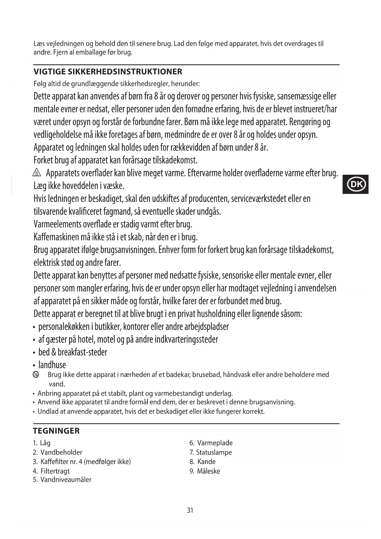 For at undgå miljø- og sundhedsmæssige problemer forårsaget af farlige stoer, må apparater og genopladelige og ikke-genopladelige batterier, der er mærket med et af disse symboler, ikke kasseres sammen med almindeligt husholdningsaald. Udtjente elektriske og elektroniske produkter samt genopladelige og ikke-genopladelige batterier fra produkterne skal aeveres på en godkendt genbrugsplads eller indsamlingssted.31 Læs vejledningen og behold den til senere brug. Lad den følge med apparatet, hvis det overdrages til andre. Fjern al emballage før brug. VIGTIGE SIKKERHEDSINSTRUKTIONER Følg altid de grundlæggende sikkerhedsregler, herunder: Dette apparat kan anvendes af børn fra 8 år og derover og personer hvis fysiske, sansemæssige eller mentale evner er nedsat, eller personer uden den fornødne erfaring, hvis de er blevet instrueret/har været under opsyn og forstår de forbundne farer. Børn må ikke lege med apparatet. Rengøring og vedligeholdelse må ikke foretages af børn, medmindre de er over 8 år og holdes under opsyn. Apparatet og ledningen skal holdes uden for rækkevidden af børn under 8 år. Forket brug af apparatet kan forårsage tilskadekomst. h Apparatets overader kan blive meget varme. Eftervarme holder overaderne varme efter brug. Læg ikke hoveddelen i væske. Hvis ledningen er beskadiget, skal den udskiftes af producenten, serviceværkstedet eller en tilsvarende kvaliceret fagmand, så eventuelle skader undgås. Varmeelements overade er stadig varmt efter brug. Kaemaskinen må ikke stå i et skab, når den er i brug. Brug apparatet ifølge brugsanvisningen. Enhver form for forkert brug kan forårsage tilskadekomst, elektrisk stød og andre farer. Dette apparat kan benyttes af personer med nedsatte fysiske, sensoriske eller mentale evner, eller personer som mangler erfaring, hvis de er under opsyn eller har modtaget vejledning i anvendelsen af apparatet på en sikker måde og forstår, hvilke farer der er forbundet med brug. Dette apparat er beregnet til at blive brugt i en privat husholdning eller lignende såsom: