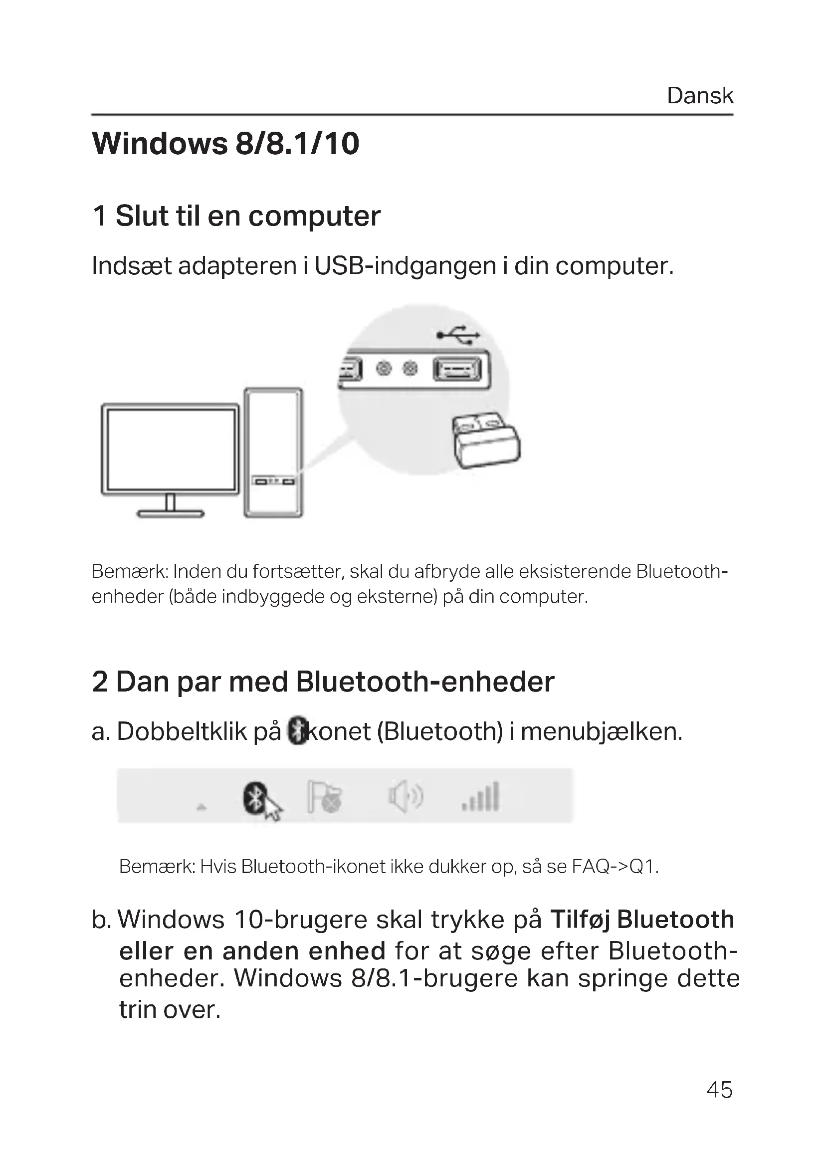Windows 8/8.1/10 1 Slut til en computer Indsæt adapteren i USB-indgangen i din computer. Bemærk: Inden du fortsætter, skal du afbryde alle eksisterende Bluetooth- enheder (både indbyggede og eksterne) på din computer. 2 Dan par med Bluetooth-enheder a. Dobbeltklik på ikonet (Bluetooth) i menubjælken. Bemærk: Hvis Bluetooth-ikonet ikke dukker op, så se FAQ->Q1. b. Windows 10-brugere skal trykke på Tilføj Bluetooth eller en anden enhed for at søge efter Bluetooth- enheder. Windows 8/8.1-brugere kan springe dette trin over.Dansk