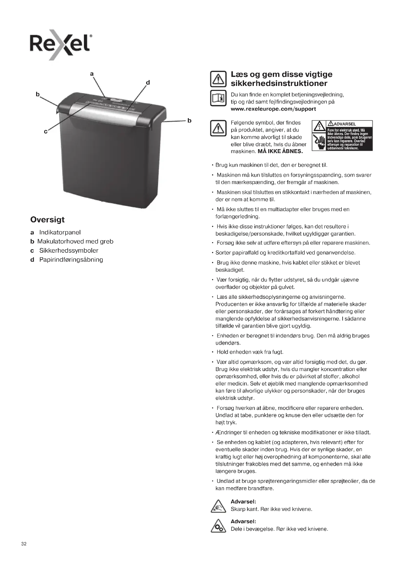 Advarsel: Skarp kant. Rør ikke ved knivene. Advarsel: Dele i bevægelse. Rør ikke ved knivene. Oversigt a Indikatorpanel b Makulatorhoved med greb c Sikkerhedssymboler d Papirindføringsåbning