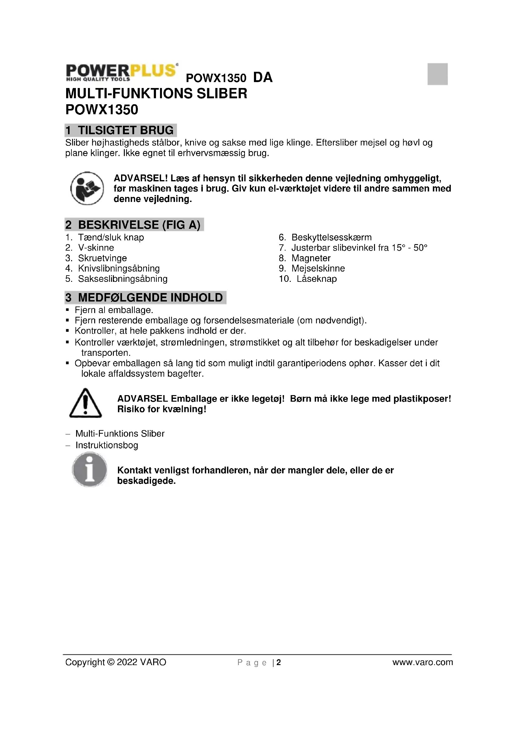 Copyright © 2022 VARO P a g e | 2 www.varo.com MULTI-FUNKTIONS SLIBER POWX1350 1 TILSIGTET BRUG Sliber højhastigheds stålbor, knive og sakse med lige klinge. Eftersliber mejsel og høvl og plane klinger. Ikke egnet til erhvervsmæssig brug. ADVARSEL! Læs af hensyn til sikkerheden denne vejledning omhyggeligt, før maskinen tages i brug. Giv kun el-værktøjet videre til andre sammen med denne vejledning. 2 BESKRIVELSE (FIG A)