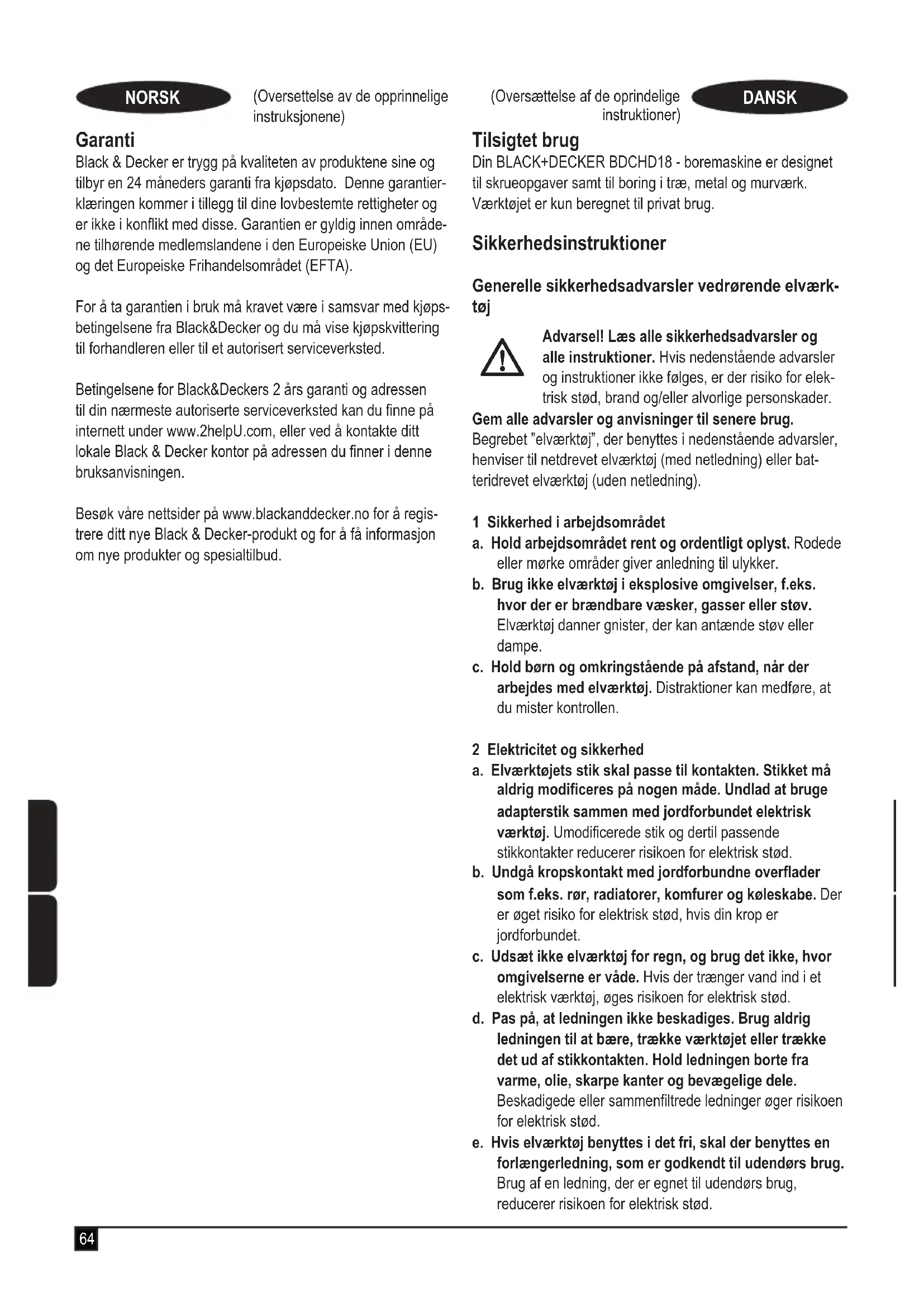 BDCDC18 - bor, skruetrækker Black & Decker erklærer, at produkterne beskrevet under ”Tekniske data” er i overensstemmelse med: 2006/42/EF, EN 60745-1, EN 60745-2-1 Disse produkter er endvidere i overensstemmelse med direktiv 2004/108/EF (indtil 19/04/2016) 2014/30/EU (fra 20/04/2016) og 2011/65/EU. Kontakt Black & Decker på nedenstående adresse eller se vejledningens bagside for at få ere oplysninger. Undertegnede er ansvarlig for kompilering af den tekniske l og udsteder denne erklæring på vegne af Black & Decker. R. Laverick Engineering Manager Black & Decker Europe, 210 Bath Road, Slough, Berkshire, SL1 3YD Storbritannien 18/11/2015 Garanti Black & Decker er sikker på kvaliteten af sine produkter og giver forbrugerne en garanti på 24 måneder fra købsdatoen. Garantien er et tillæg til forbrugerens lovsikrede rettigheder og påvirker ikke disse. Garantien er gyldig inden for medlems- staterne af Den Europæiske Union og Det Europæiske Frihandelsområde. Når du gør krav på garantien, skal kravet være i overens- stemmelse med Black&Decker vilkår og betingelser, og du skal indsende dokumentation for købet til sælgeren eller til en autoriseret reparatør. Vilkår og betingelser for Black & Decker 2 års garanti og placeringen af dit nærmeste autoriserede serviceværksted kan fås på internettet på www.2helpU.com, eller ved at kontakte dit.lokale Black & Decker kontor på den adresse, der er angivet i denne vejledning. Besøg venligst vores websted www.blackanddecker.co.uk for at registrere dit nye Black & Decker produkt og modtage opdateringer om nye produkter og specielle tilbud.71 (Alkuperäisten ohjeiden käännös) SUOMI Käyttötarkoitus Tämä BLACK+DECKER BDCHD18 -porakone on tarkoitettu ruuvien kiinnittämiseen sekä puun, metallin ja betonin poraa- miseen. Tämä työkalu on tarkoitettu vain yksityiskäyttöön. Turvallisuusohjeet Sähkötyökalujen yleiset turvavaroitukset