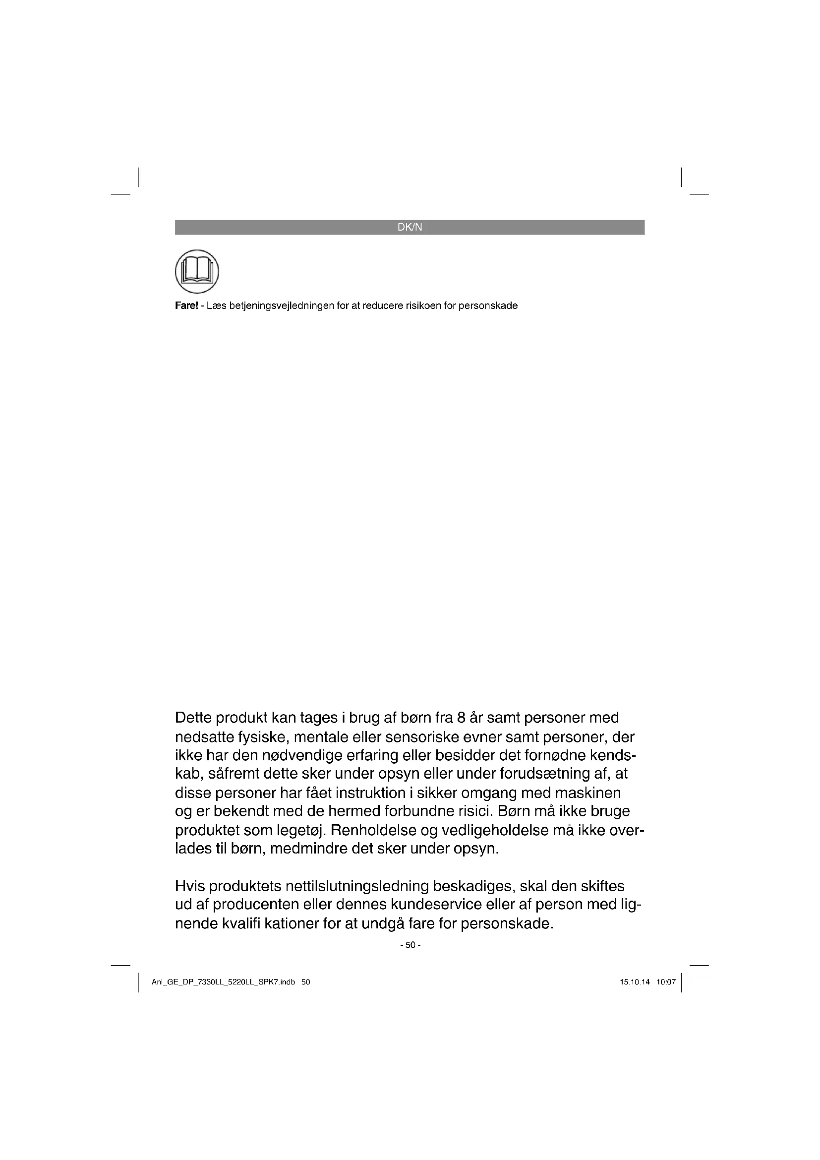 Dette produkt kan tages i brug af børn fra 8 år samt personer med nedsatte fysiske, mentale eller sensoriske evner samt personer, der ikke har den nødvendige erfaring eller besidder det fornødne kends- kab, såfremt dette sker under opsyn eller under forudsætning af, at disse personer har fået instruktion i sikker omgang med maskinen og er bekendt med de hermed forbundne risici. Børn må ikke bruge produktet som legetøj. Renholdelse og vedligeholdelse må ikke over- lades til børn, medmindre det sker under opsyn. Hvis produktets nettilslutningsledning beskadiges, skal den skiftes ud af producenten eller dennes kundeservice eller af person med lig- nende kvalifi kationer for at undgå fare for personskade. Fare! - Læs betjeningsvejledningen for at reducere risikoen for personskade Anl_GE_DP_7330LL_5220LL_SPK7.indb 50Anl_GE_DP_7330LL_5220LL_SPK7.indb 50 15.10.14 10:0715.10.14 10:07DK/N