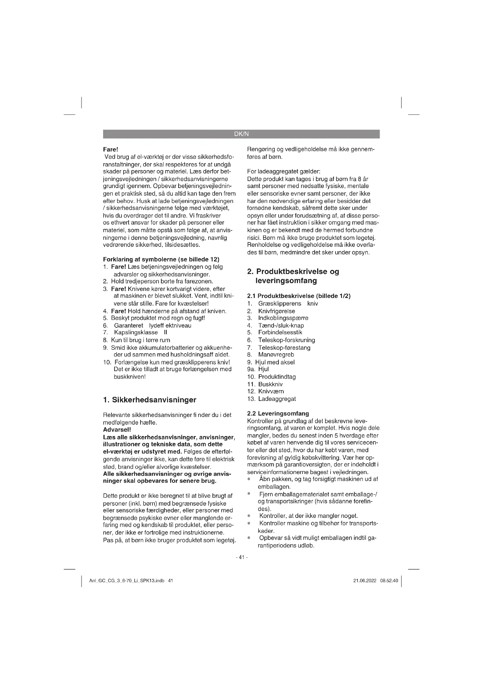 Lad græsklipperen glide hen over jorden. Den bedste klippeydelse opnås med tør plæne. Når den ikke bruges, skal knivbeskyttelseskap- pen skubbes fast på kniven. Anl_GC_CG_3_6-70_Li_SPK13.indb 43Anl_GC_CG_3_6-70_Li_SPK13.indb 43 21.06.2022 08:52:4021.06.2022 08:52:40DK/N