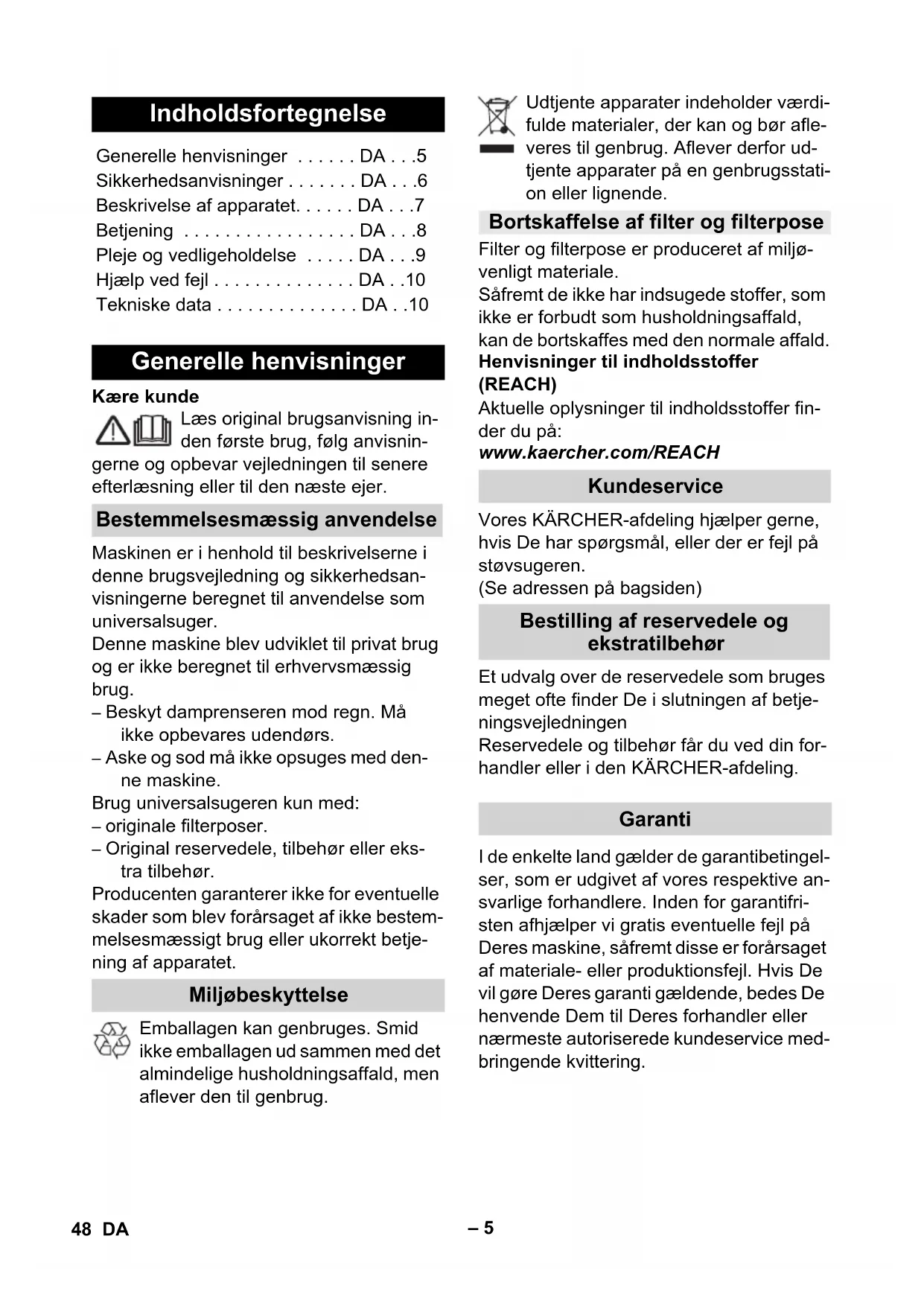 • Potência P nom 1000 W Protecção de rede (de ac- ção lenta) 10 A Volume do recipiente 20 l Admissão de água com a pega 12 l Admissão de água com o bocal de pavimento 10 l Cabo de rede H05VV-F 2x0,75 Nível de pressão acústica (EN 60704-2-1) 72 dB(A) Peso (sem acessórios) MV 4 7,0 kg Peso (sem acessórios) MV 4 Premium 7,3 kg 47PT– 5 Kære kunde Læs original brugsanvisning in- den første brug, følg anvisnin- gerne og opbevar vejledningen til senere efterlæsning eller til den næste ejer. Maskinen er i henhold til beskrivelserne i denne brugsvejledning og sikkerhedsan- visningerne beregnet til anvendelse som universalsuger. Denne maskine blev udviklet til privat brug og er ikke beregnet til erhvervsmæssig brug. – Beskyt damprenseren mod regn. Må ikke opbevares udendørs. – Aske og sod må ikke opsuges med den- ne maskine. Brug universalsugeren kun med: – originale filterposer. – Original reservedele, tilbehør eller eks- tra tilbehør. Producenten garanterer ikke for eventuelle skader som blev forårsaget af ikke bestem- melsesmæssigt brug eller ukorrekt betje- ning af apparatet. Emballagen kan genbruges. Smid ikke emballagen ud sammen med det almindelige husholdningsaffald, men aflever den til genbrug. Udtjente apparater indeholder værdi- fulde materialer, der kan og bør afle- veres til genbrug. Aflever derfor ud- tjente apparater på en genbrugsstati- on eller lignende. Filter og filterpose er produceret af miljø- venligt materiale. Såfremt de ikke har indsugede stoffer, som ikke er forbudt som husholdningsaffald, kan de bortskaffes med den normale affald. Henvisninger til indholdsstoffer (REACH) Aktuelle oplysninger til indholdsstoffer fin- der du på: www.kaercher.com/REACH Vores KÄRCHER-afdeling hjælper gerne, hvis De har spørgsmål, eller der er fejl på støvsugeren. (Se adressen på bagsiden) Et udvalg over de reservedele som bruges meget ofte finder De i slutningen af betje- ningsvejledningen Reservedele og tilbehør får du ved din for- handler eller i den KÄRCHER-afdeling. I de enkelte land gælder de garantibetingel- ser, som er udgivet af vores respektive an- svarlige forhandlere. Inden for garantifri- sten afhjælper vi gratis eventuelle fejl på Deres maskine, såfremt disse er forårsaget af materiale- eller produktionsfejl. Hvis De vil gøre Deres garanti gældende, bedes De henvende Dem til Deres forhandler eller nærmeste autoriserede kundeservice med- bringende kvittering. Indholdsfortegnelse Generelle henvisninger