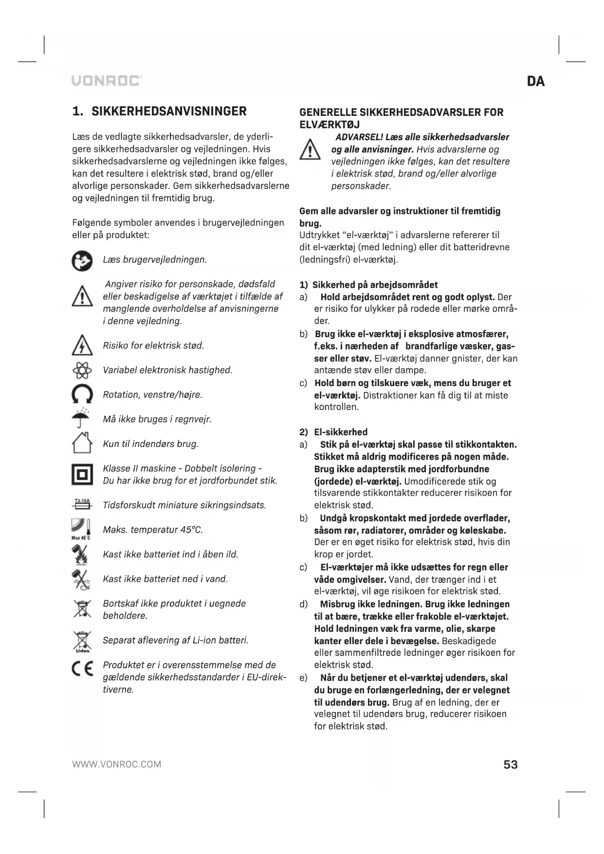 MILJØ Defekte og/eller bortskaffede elektriske og elektroniske apparater skal afleveres på en passende genbrugsstation. Kun for lande iEU Maskinværktøj må ikke bortskaffes sammen med husholdningsaffald. Ifølge EC-direktiv 2012/19/ EU om affald af elektrisk og elektronisk udstyr og dets gennemførelse iden nationale lovgivning skal maskinværktøjer, der ikke længere anvendes, afleveres separat og bortskaffes på en miljøvenlig måde. GARANTI VONROC-produkter er udviklet til de højeste kva- litetsstandarder og er garanteret fri for defekter ibåde materialer og udførelse iden periode, der er retsligt angivet fra datoen for det originale køb. Hvis produktet skulle udvikle fejl idenne periode på grund af defekt materiale og/eller udførelse, bedes du kontakte VONROC direkte. Følgende omstændigheder er udelukket fra denne garanti: