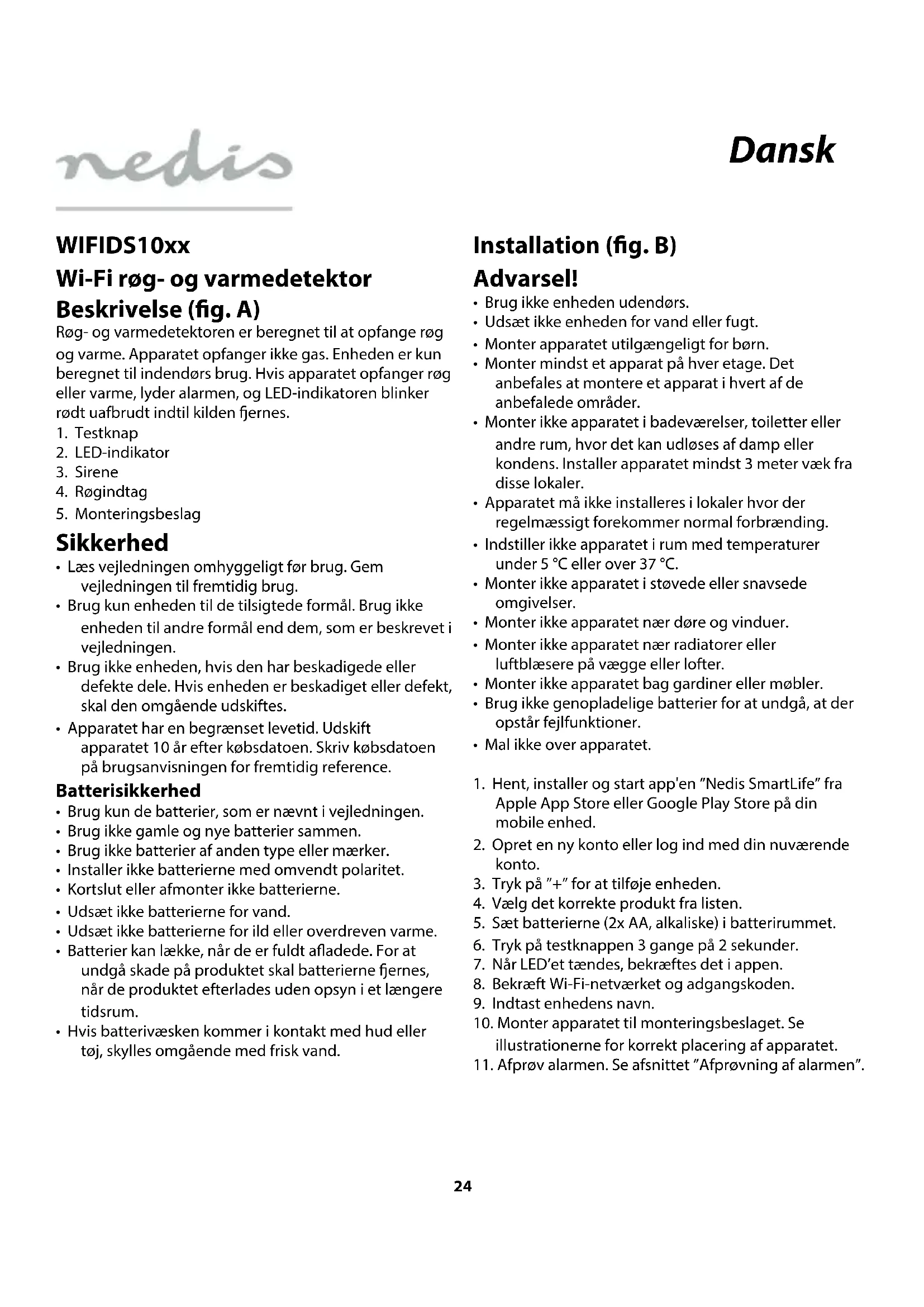 WIFIDS10xx Wi-Fi røg- og varmedetektor Beskrivelse (g. A) Røg- og varmedetektoren er beregnet til at opfange røg og varme. Apparatet opfanger ikke gas. Enheden er kun beregnet til indendørs brug. Hvis apparatet opfanger røg eller varme, lyder alarmen, og LED-indikatoren blinker rødt uafbrudt indtil kilden ernes.