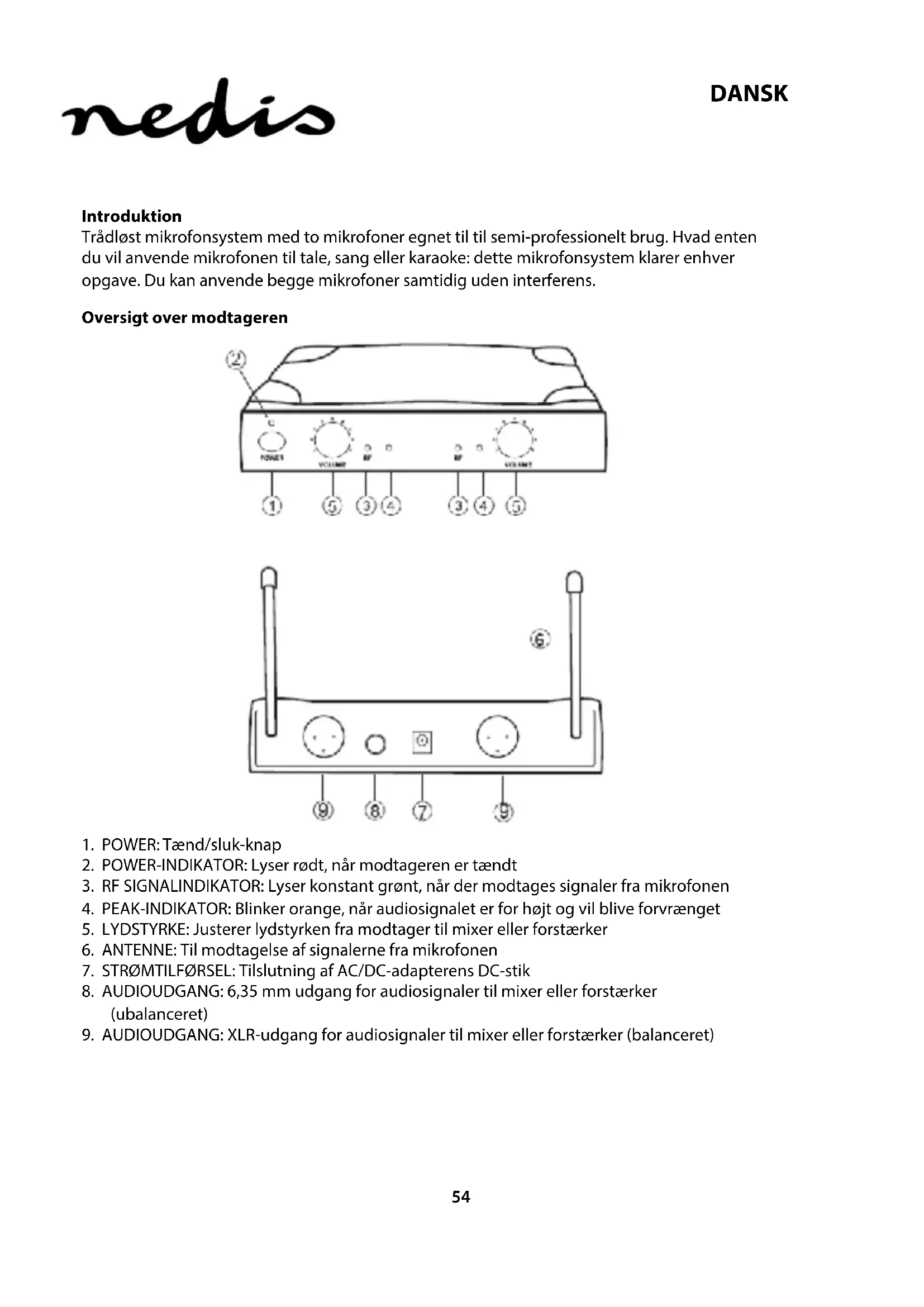 - RF SIGNALINDIKATOR: Lyser konstant gront, när der modtages signaler fra mikrofonen
