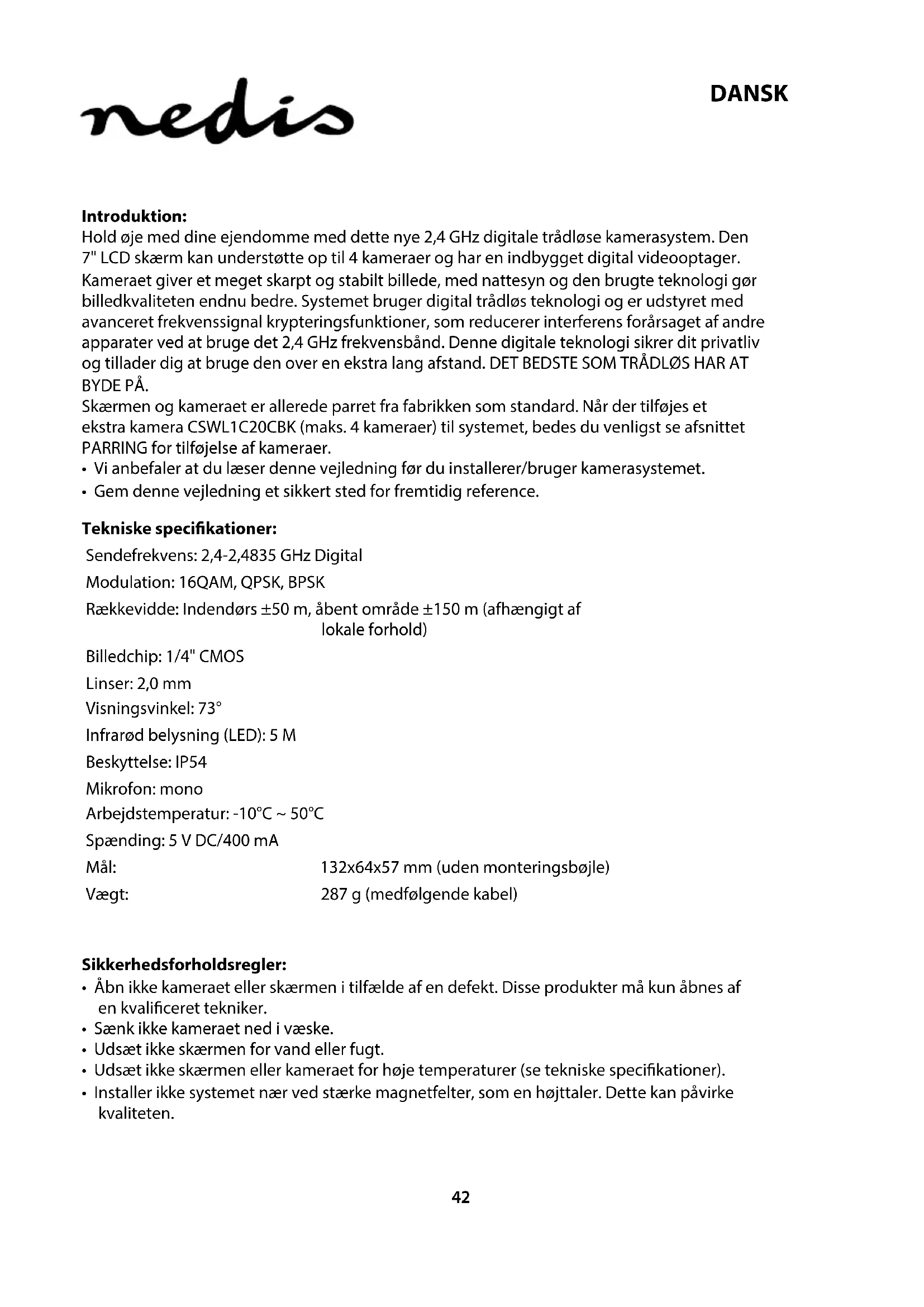 - Gem denne vejledning et sikkert sted for fremtidig reference. Tekniske specikationer: Sendefrekvens: 2,4-2,4835 GHz Digital Modulation: 16QAM, QPSK, BPSK Rækkevidde: Indendørs ±50 m, åbent område ±150 m (afhængigt af lokale forhold) Billedchip: 1/4" CMOS Linser: 2,0 mm Visningsvinkel: 73° Infrarød belysning (LED): 5 M Beskyttelse: IP54 Mikrofon: mono Arbejdstemperatur: -10°C ~ 50°C Spænding: 5 V DC/400 mA Mål: 132x64x57 mm (uden monteringsbøjle) Vægt: 287 g (medfølgende kabel) Sikkerhedsforholdsregler: