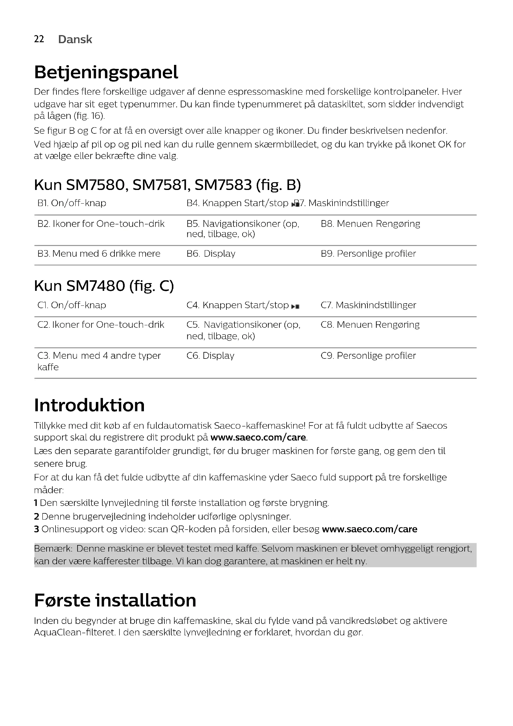 Dansk A27 RensebørsteBetjeningspanel Der findes flere forskellige udgaver af denne espressomaskine med forskellige kontrolpaneler. Hver udgave har sit eget typenummer. Du kan finde typenummeret på dataskiltet, som sidder indvendigt på lågen (fig. 16). Se figur B og C for at få en oversigt over alle knapper og ikoner. Du finder beskrivelsen nedenfor. Ved hjælp af pil op og pil ned kan du rulle gennem skærmbilledet, og du kan trykke på ikonet OK for at vælge eller bekræfte dine valg. Kun SM7580, SM7581, SM7583 (fig. B) B1. On/off-knap B4. Knappen Start/stop B7. Maskinindstillinger B2. Ikoner for One-touch-drik B5. Navigationsikoner (op, ned, tilbage, ok) B8. Menuen Rengøring B3. Menu med 6 drikke mere B6. Display B9. Personlige profiler Kun SM7480 (fig. C) C1. On/off-knap C4. Knappen Start/stop C7. Maskinindstillinger C2. Ikoner for One-touch-drik C5. Navigationsikoner (op, ned, tilbage, ok) C8. Menuen Rengøring C3. Menu med 4 andre typer kaffe C6. Display C9. Personlige profiler Introduktion Tillykke med dit køb af en fuldautomatisk Saeco -kaffemaskine! For at få fuldt udbytte af Saecos support skal du registrere dit produkt på www.saeco.com/care. Læs den separate garantifolder grundigt, før du bruger maskinen for første gang, og gem den til senere brug. For at du kan få det fulde udbytte af din kaffemaskine yder Saeco fuld support på tre forskellige måder: 1 Den særskilte lynvejledning til første installation og første brygning. 2 Denne brugervejledning indeholder udførlige oplysninger. 3 Onlinesupport og video: scan QR-koden på forsiden, eller besøg www.saeco.com/care Bemærk: Denne maskine er blevet testet med kaffe. Selvom maskinen er blevet omhyggeligt rengjort, kan der være kafferester tilbage. Vi kan dog garantere, at maskinen er helt ny. Første installation Inden du begynder at bruge din kaffemaskine, skal du fylde vand på vandkredsløbet og aktivere AquaClean-filteret. I den særskilte lynvejledning er forklaret, hvordan du gør.