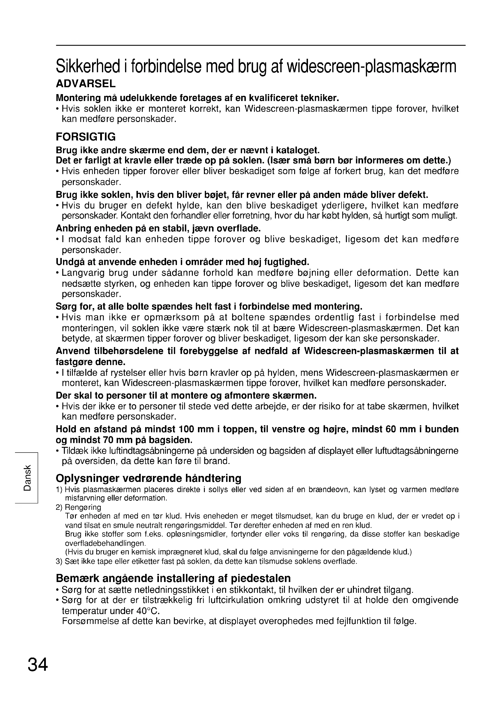 Sikkerhed i forbindelse med brug af widescreen-plasmaskærm ADVARSEL Montering må udelukkende foretages af en kvalificeret tekniker.