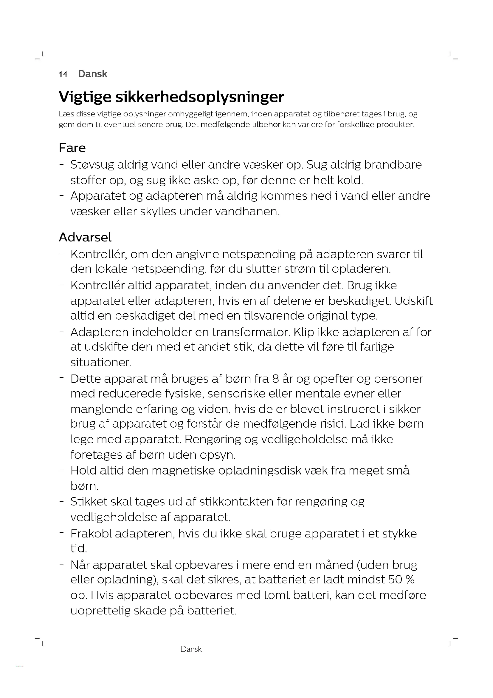 EnglishDansk Vigtige sikkerhedsoplysninger Læs disse vigtige oplysninger omhyggeligt igennem, inden apparatet og tilbehøret tages i brug, oggem dem til eventuel senere brug. Det medfølgende tilbehør kan variere for forskellige produkter. Fare
