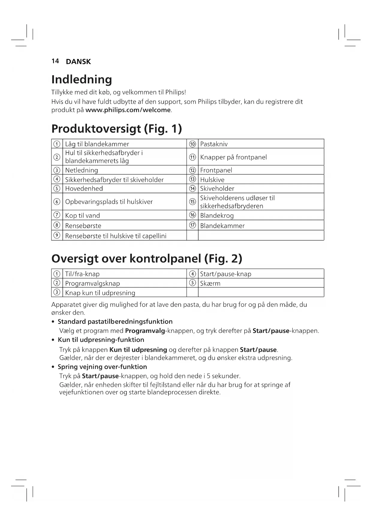 - Spring vejning over-funktion Tryk på Start/pause-knappen, og hold den nede i 5 sekunder. Gælder, når enheden skifter til fejltilstand eller når du har brug for at springe af vejefunktionen over og starte blandeprocessen direkte.15 DANSK Adskillelse og rengøring før første ibrugtagning 1 Tag låget af blandekammeret. (Fig.3) 2 Løsn frontpanelets betjeningsknapper. (Fig.4) Bemærk: Frontpanelet er tungt. Vær ekstra forsigtig, når du afmonterer det. 3 Afmonter frontpanel, hulskive, hulskiveholder, blandekrog og blandekammer i nævnte rækkefølge. (Fig.5) 4 Rengør alle aftagelige dele, og tør dem af. (Fig.6) 5 Træk skuen til hulskiven ud, og rengør alle skiver og rengøringsværktøjer. (Fig.7) Samling 1 Sæt blandekammeret i apparatet. (Fig.8) 2 Stik blandekrog ind i hullet i hovedenheden. Stik blandekrog helt ind i hovedenheden. (Fig.9) 3 Sæt skiveholderen fast på apparatet. (Fig.10) 4 Sæt hulskiven i skiveholderen, og sørg for, at den sidder fast på skiveholderen. (Fig.11) Bemærk: Sørg for, at hulskivens og skiveholderens indvendige hulrum er monteret korrekt. (Fig.12) 5 Fastgør frontpanelet på hovedenheden. (Fig.13) Bemærk: Frontpanelet er tungt. Vær ekstra forsigtig, når du monterer det. 6 Fastgør frontpanelets kontrolknapper. (Fig.14) Bemærk: y Hvis frontpanelet eller hulskiven ikke er monteret korrekt, vil en sikkerhedsafbryder afbryde apparatet. y Sørg for, at frontpanelet er helt fastmonteret før brug af apparatet. 7 Luk blandekammerets låg. (Fig. 21) Sådan bruges pastamaskinen Start tilberedning 1 Sæt stikket i stikkontakten. Pastamaskinen udsender et enkelt signal, og alle indikatorerne blinker én gang. (Fig.15) Bemærk: Sørg for, at alle delene er monteret korrekt, inden stikket sættes i. 2 Tænd apparatet ved at trykke på On/o-knappen. (Fig.16) 3 Vælg pastatype med Programvalg-knappen. (Fig.17) Tip: y Hvis du tilbereder en opskrift med æg og vand, skal du slå ægget ud og lægge det hele æg i vandkoppen og fylde op med vand til den påkrævede mængde. y I stedet for vand kan du også bruge grøntsagsjuice (f.eks. spinatjuice, rødbedejuice osv.).16 DANSK Program Tip Valgfri opskrift Almindelige pasta/ nudler