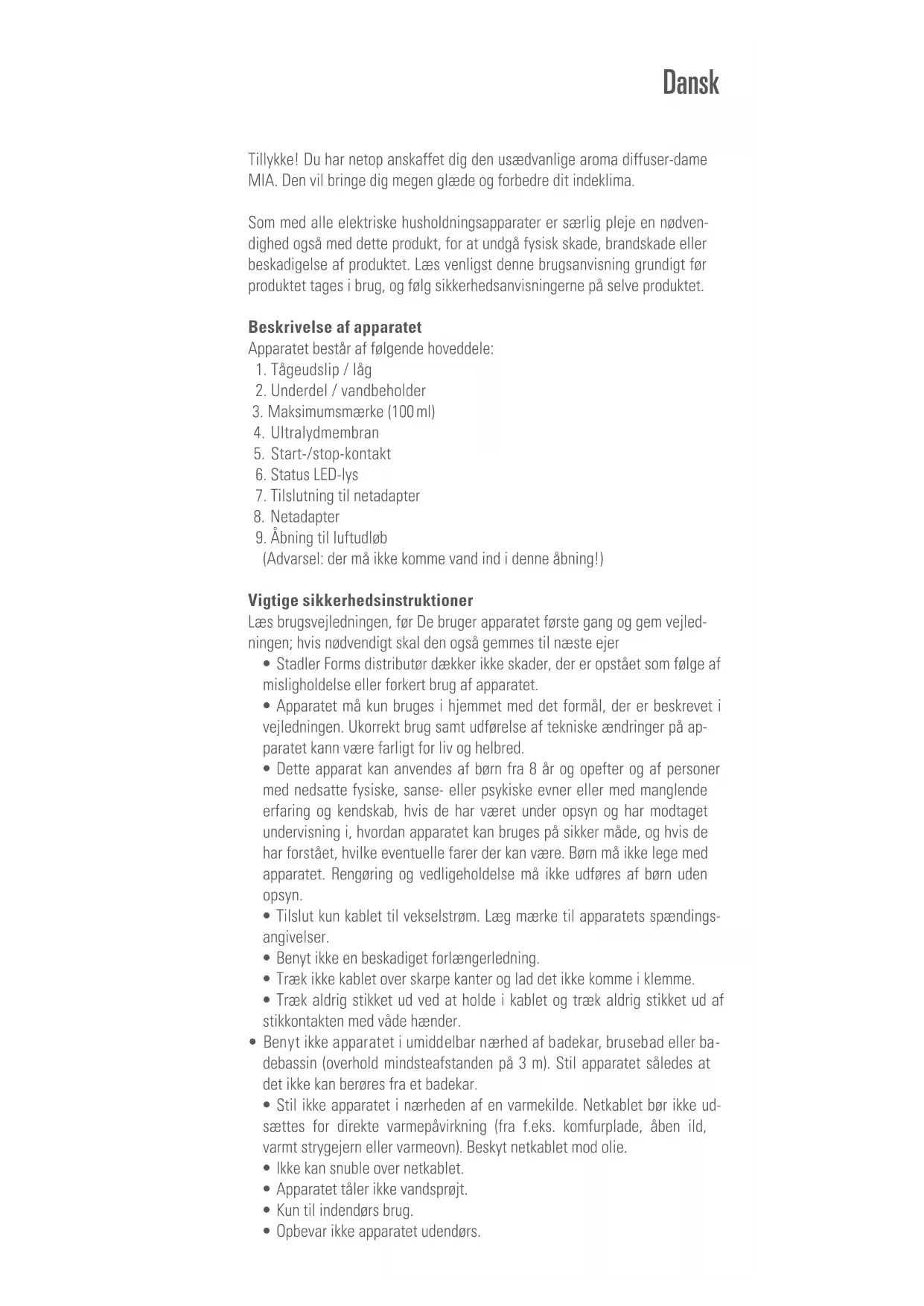 Download vejledningen til din Aromadiffuser i PDF-format gratis! Find din vejledning Mia - STADLER FORM og tag din elektroniske enhed tilbage i hånden. På denne side er alle dokumenter nødvendige for brugen af din enhed offentliggjort. Mia af mærket STADLER FORM.