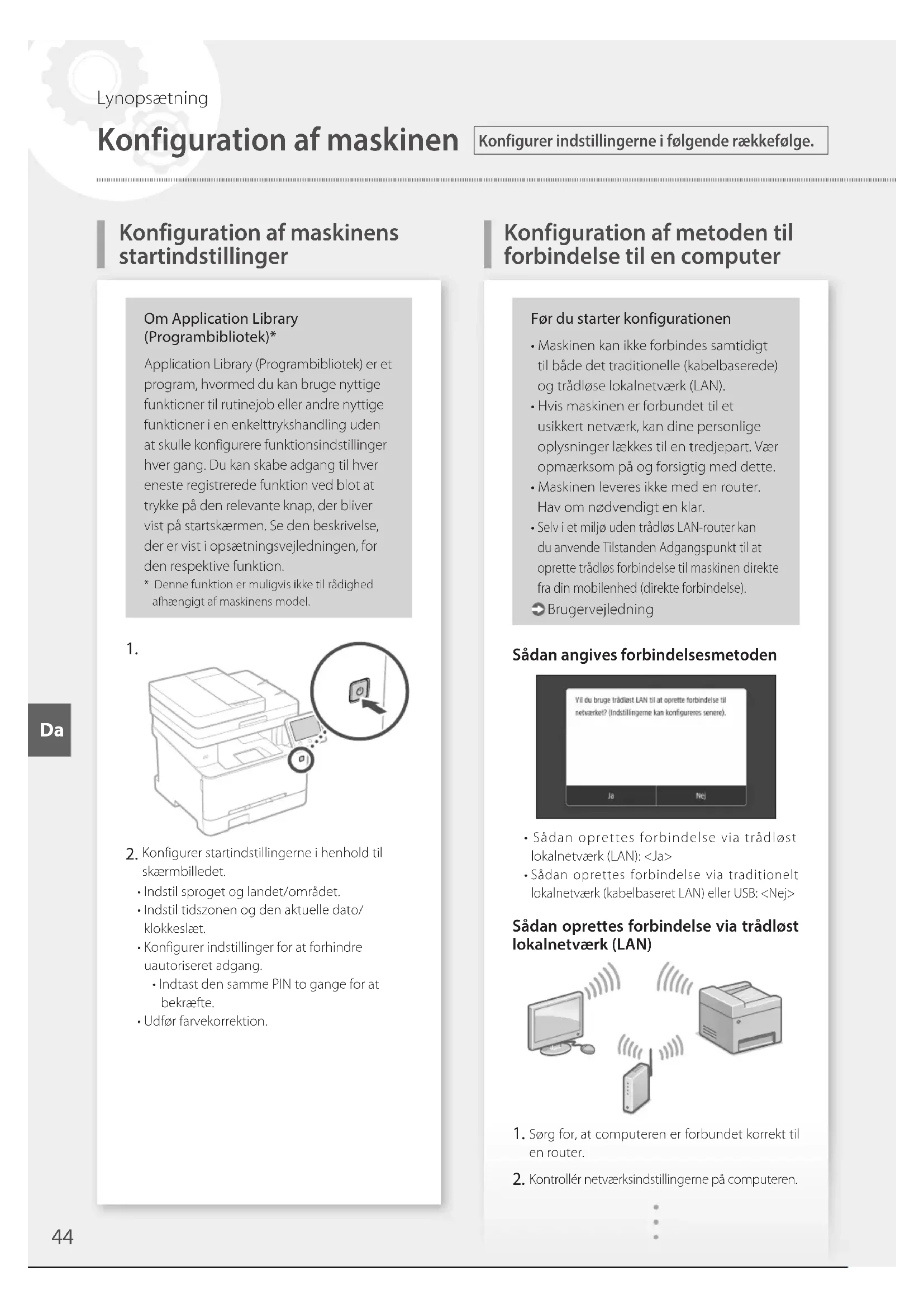 Γρήγορηδιαμόρφωση ElElKonfiguration af metoden til forbindelse til en computer Om Application Library (Programbibliotek)* Application Library (Programbibliotek) er et program, hvormed du kan bruge nyttige funktioner til rutinejob eller andre nyttige funktioner i en enkelttrykshandling uden at skulle konfigurere funktionsindstillinger hver gang. Du kan skabe adgang til hver eneste registrerede funktion ved blot at trykke på den relevante knap, der bliver vist på startskærmen. Se den beskrivelse, der er vist i opsætningsvejledningen, for den respektive funktion.* Denne funktion er muligvis ikke til rådighed afhængigt af maskinens model.