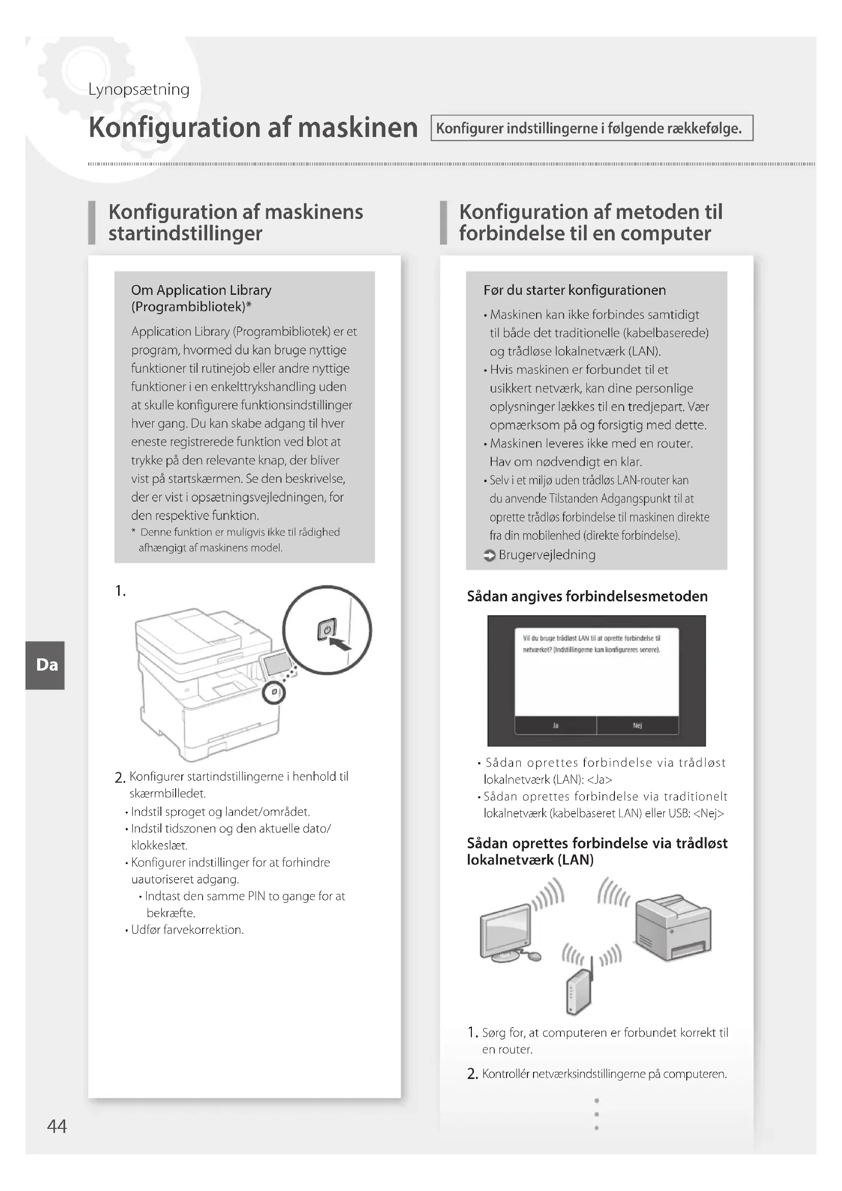 Γρήγορηδιαμόρφωση ElElKonfiguration af metoden til forbindelse til en computer Om Application Library (Programbibliotek)* Application Library (Programbibliotek) er et program, hvormed du kan bruge nyttige funktioner til rutinejob eller andre nyttige funktioner i en enkelttrykshandling uden at skulle konfigurere funktionsindstillinger hver gang. Du kan skabe adgang til hver eneste registrerede funktion ved blot at trykke på den relevante knap, der bliver vist på startskærmen. Se den beskrivelse, der er vist i opsætningsvejledningen, for den respektive funktion.* Denne funktion er muligvis ikke til rådighed afhængigt af maskinens model.