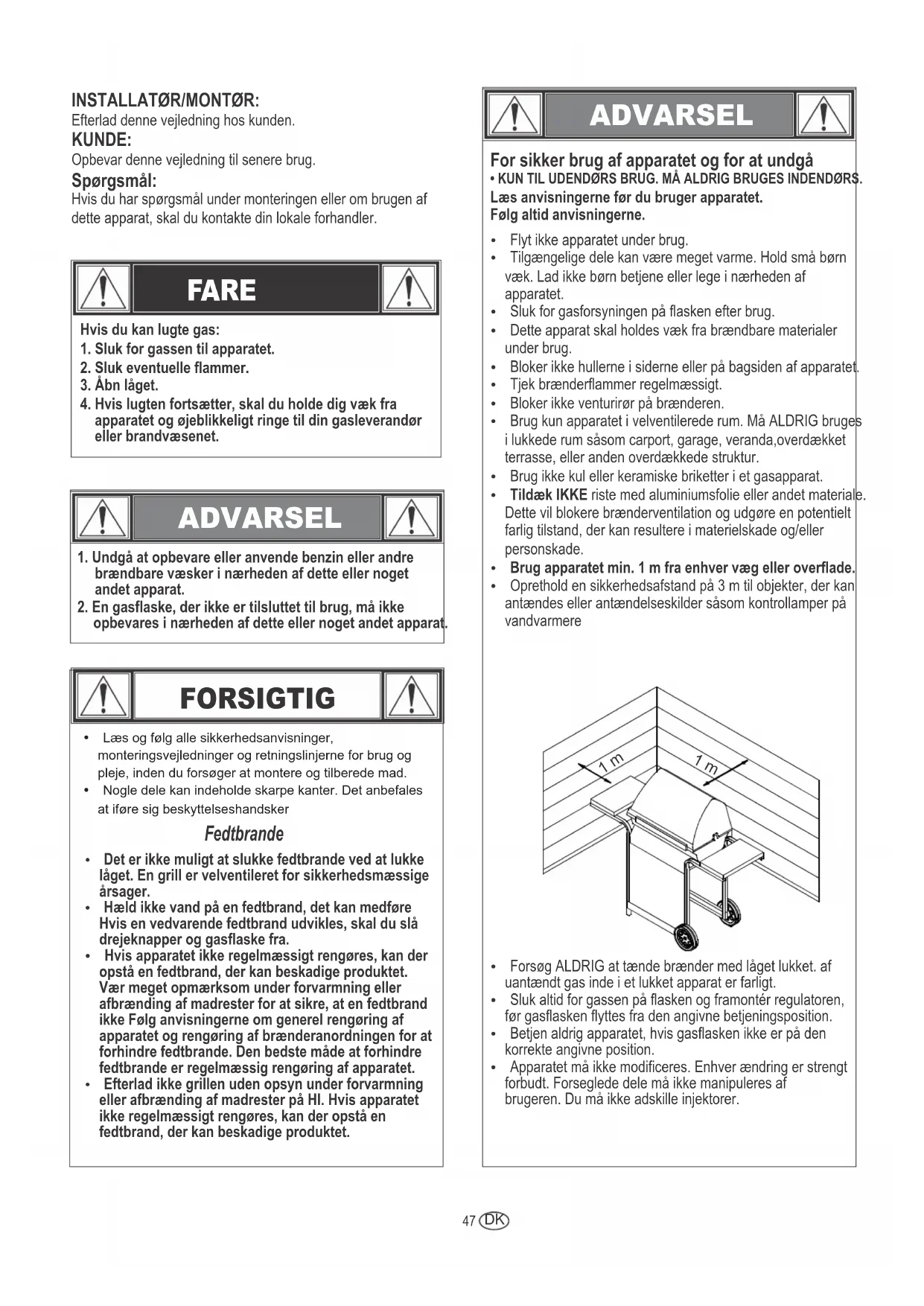 - KUN TIL UDENDØRS BRUG. MÅ ALDRIG BRUGES INDENDØRS.Læs anvisningerne før du bruger apparatet.Følg altid anvisningerne.Ÿ Flyt ikke apparatet under brug.Ÿ Tilgængelige dele kan være meget varme. Hold små børn væk. Lad ikke børn betjene eller lege i nærheden af apparatet.Ÿ Sluk for gasforsyningen på flasken efter brug.Ÿ Dette apparat skal holdes væk fra brændbare materialer under brug.Ÿ Bloker ikke hullerne i siderne eller på bagsiden af apparatet.Ÿ Tjek brænderflammer regelmæssigt.Ÿ Bloker ikke venturirør på brænderen.Ÿ Brug kun apparatet i velventilerede rum. Må ALDRIG bruges i lukkede rum såsom carport, garage, veranda,overdækket terrasse, eller anden overdækkede struktur.Ÿ Brug ikke kul eller keramiske briketter i et gasapparat.Ÿ Tildæk IKKE riste med aluminiumsfolie eller andet materiale. Dette vil blokere brænderventilation og udgøre en potentielt farlig tilstand, der kan resultere i materielskade og/eller personskade.Ÿ Brug apparatet min. 1 m fra enhver væg eller overflade.Ÿ Oprethold en sikkerhedsafstand på 3 m til objekter, der kan antændes eller antændelseskilder såsom kontrollamper på vandvarmereŸ Forsøg ALDRIG at tænde brænder med låget lukket. af uantændt gas inde i et lukket apparat er farligt.Ÿ Sluk altid for gassen på flasken og framontér regulatoren, før gasflasken flyttes fra den angivne betjeningsposition.Ÿ Betjen aldrig apparatet, hvis gasflasken ikke er på den korrekte angivne position.Ÿ Apparatet må ikke modificeres. Enhver ændring er strengt forbudt. Forseglede dele må ikke manipuleres af brugeren. Du må ikke adskille injektorer. 1 m 1 m