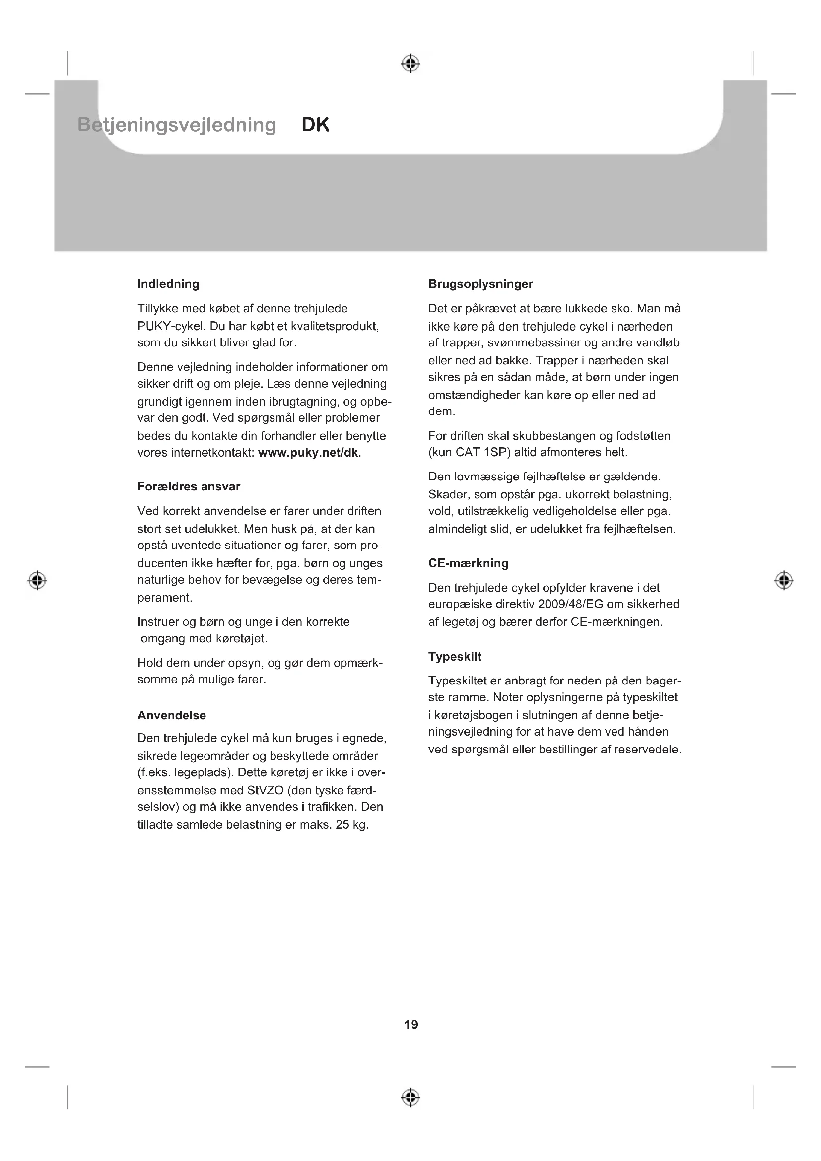 Denne vegledning indeholder informationer om sikker drift og om pleje. Læs denne vegledning grundigt igennem indenibrugtagning, og opbevar den godt. Ved sporgsmål erler problemer bedes du kontakte din forhandler erler benytte vores internetkontakt: www.puky.net/dk.