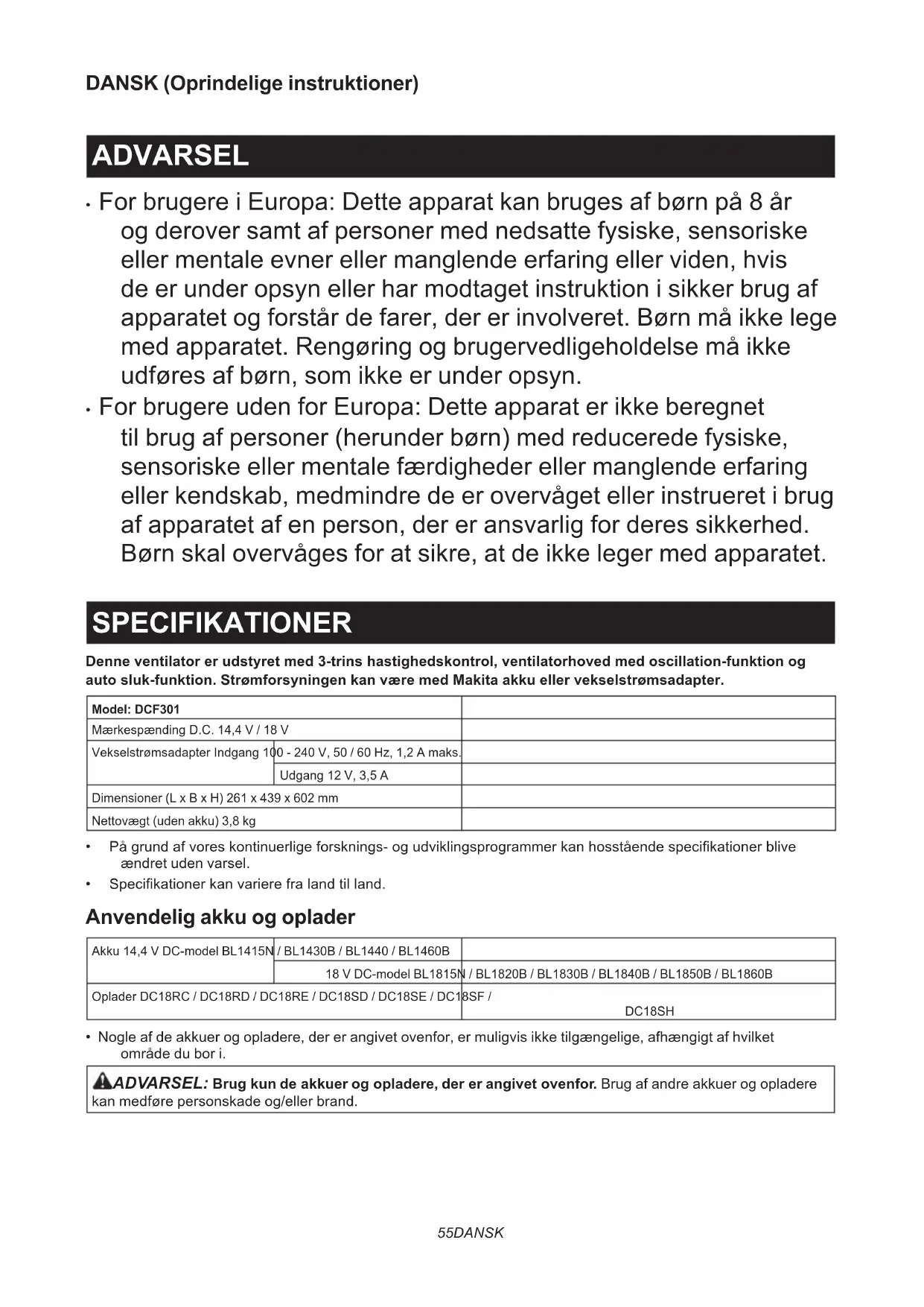 - For brugere uden for Europa: Dette apparat er ikke beregnet til brug af personer (herunder børn) med reducerede fysiske, sensoriske eller mentale færdigheder eller manglende erfaring eller kendskab, medmindre de er overvåget eller instrueret i brug af apparatet af en person, der er ansvarlig for deres sikkerhed. Børn skal overvåges for at sikre, at de ikke leger med apparatet. SPECIFIKATIONER Denne ventilator er udstyret med 3-trins hastighedskontrol, ventilatorhoved med oscillation-funktion og auto sluk-funktion. Strømforsyningen kan være med Makita akku eller vekselstrømsadapter. Model: DCF301Mærkespænding D.C. 14,4 V / 18 VVekselstrømsadapter Indgang 100 - 240 V, 50 / 60 Hz, 1,2 A maks.Udgang 12 V, 3,5 ADimensioner (L x B x H) 261 x 439 x 602 mmNettovægt (uden akku) 3,8 kg