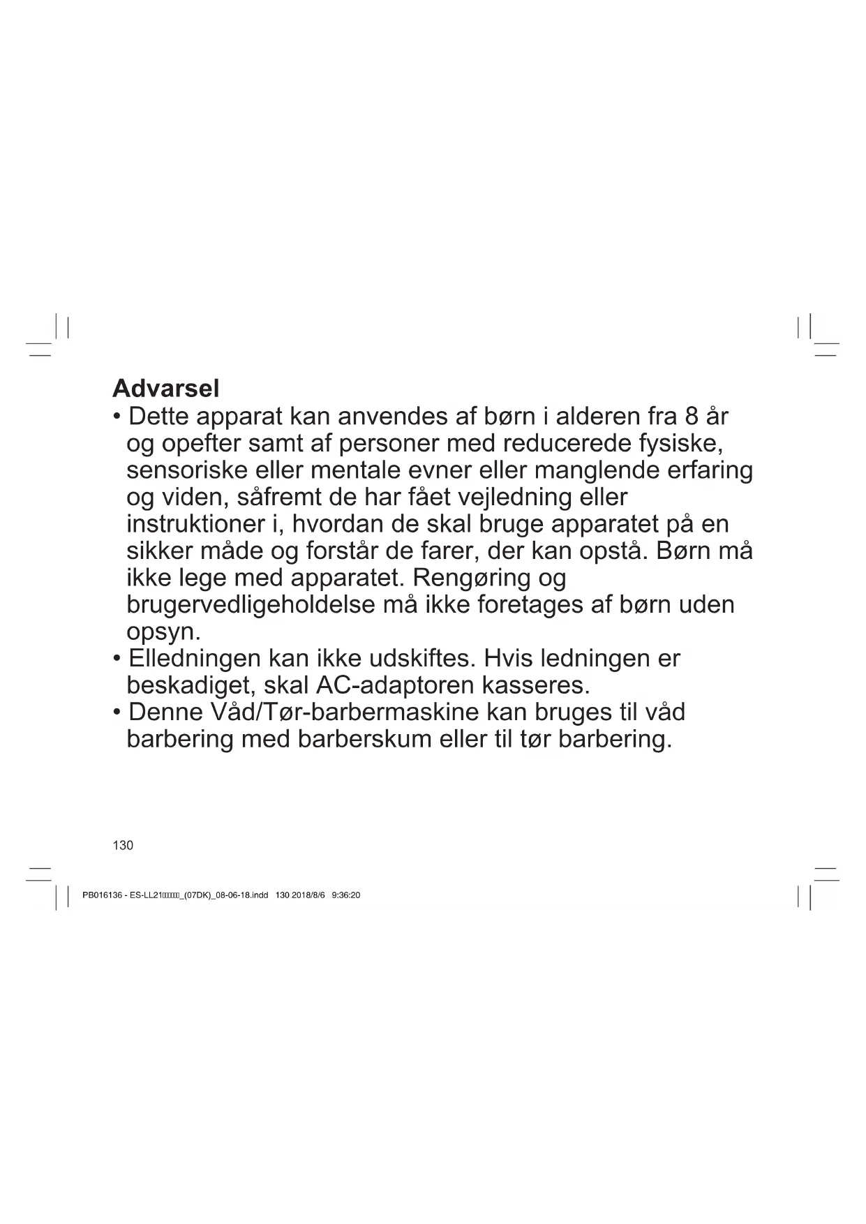 - Der er en unormal lyd under brugen eller ved opladning af hoveddelen, adapteren eller ledningen. - Anmod omgående om eftersyn eller reparation hos et autoriseret servicecenter. ► Strømforsyning Adaptoren må aldrig sættes i stikkontakten eller tages ud med våde hænder. - Dette kan resultere i elektrisk stød eller personskade. AC-adaptoren må ikke nedsænkes i vand eller vaskes med vand. Anbring ikke AC-adaptoren over eller i nærheden af en vask eller et badekar, der er fyldt med vand. Benyt aldrig apparatet, hvis AC-adaptoren er beskadiget, eller hvis strømstikket sidder løst i stikkontakten. Elledningen må ikke beskadiges eller ændres, ej heller bøjes, trækkes eller snoes med kraft. Ydermere må ledningen ikke klemmes eller ligge under noget tungt. - Dette kan resultere i elektrisk stød eller brand som følge af kortslutning. Produktet må ikke anvendes på nogen måde der overstiger den angivne kapacitet for stikkontakten eller ledningsnettet. - Hvis den angivne kapacitet overskrides ved at der tilsluttes for mange stik til én kontakt, kan det forårsage brand som følge af overophedning. Sørg altid for, at apparatet anvendes med en elektrisk strømkilde, der passer til den normerede spænding, som er angivet på AC-adaptoren. Sæt adaptoren til apparatet helt i. - Undladelse heraf kan resultere i brand eller elektrisk stød. Tag stikket til AC-adaptoren ud af stikkontakten, når du rengør barbermaskinen med vand. - Undladelse heraf kan resultere i elektrisk stød eller personskade. Rengør regelmæssigt strømstikket og barbermaskinestikket for at forhindre støvansamling. - Undladelse heraf kan resultere i brand som følge af isoleringsfejl forårsaget af fugt. PB016136 - ES-LL21_(07DK)_08-06-18.indd 133 2018/8/6 9:36:20134