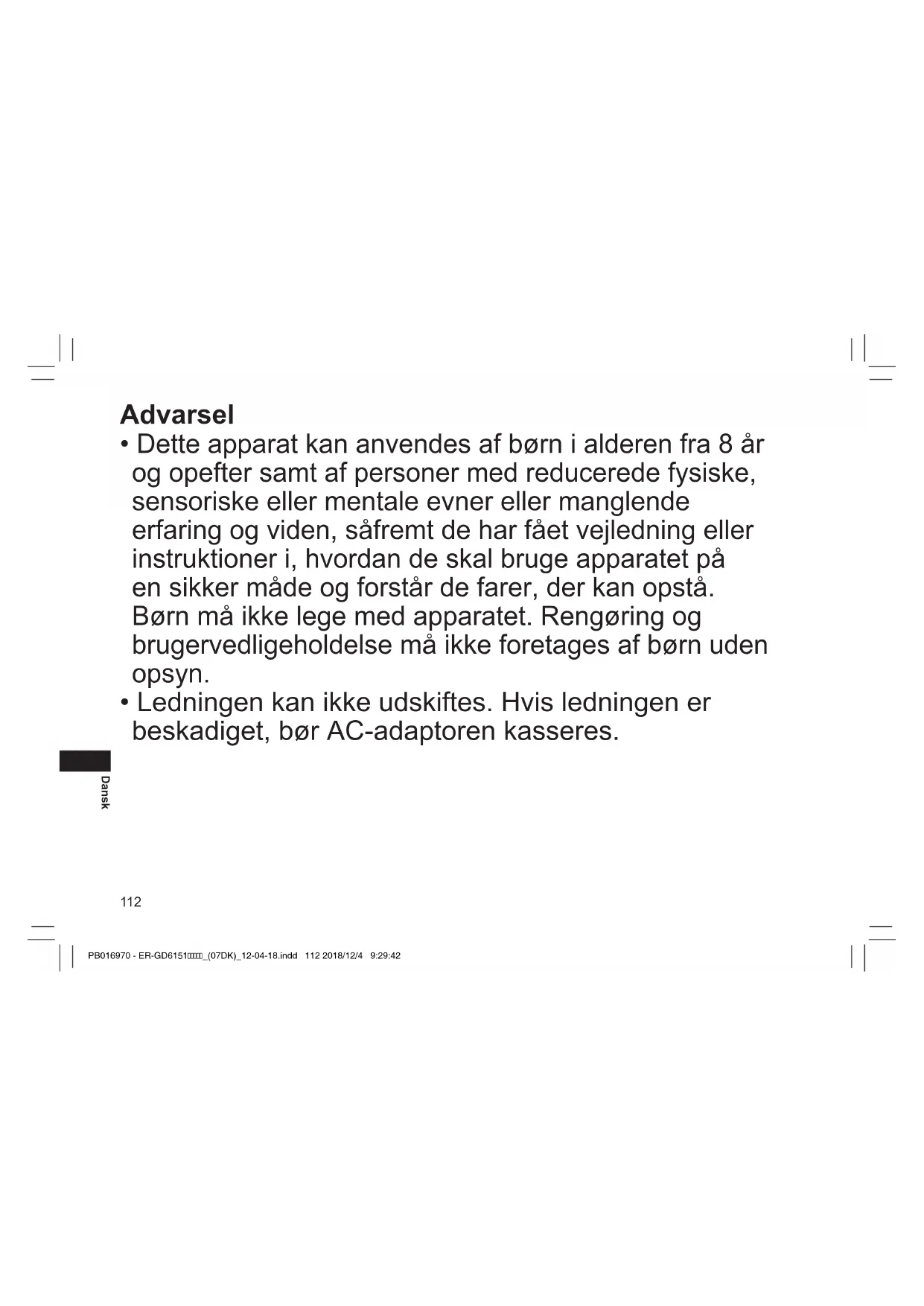- Ledningen kan ikke udskiftes. Hvis ledningen er beskadiget, bør AC-adaptoren kasseres. PB016970 - ER-GD6151_(07DK)_12-04-18.indd 112 2018/12/4 9:29:42113 Dansk
