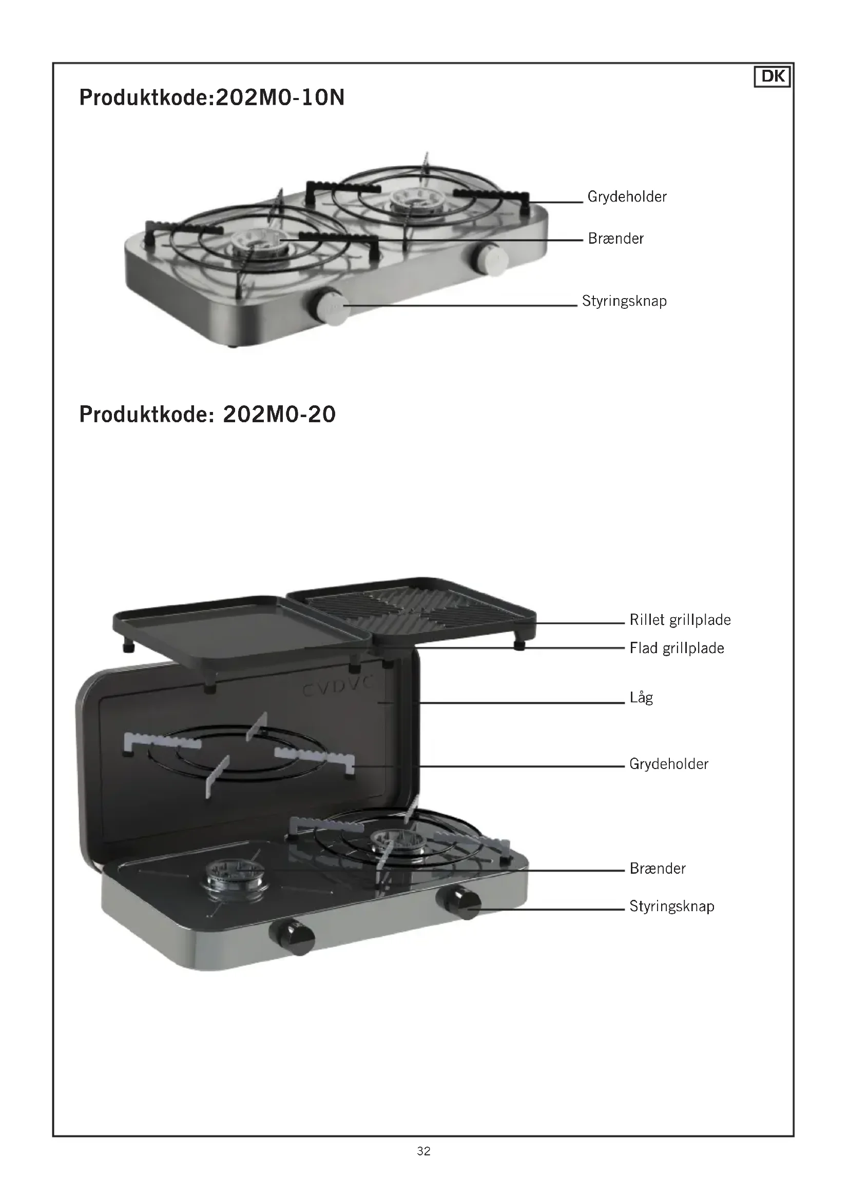 BEMÆRK VENLIGST: Sørg venligst for at al beskyttende emballage og plastik fjernes fra enheden før den tages i brug. Enheden må kun benyttes med en godkendte slange og regulator (slange og regulator følger med enheden i Sydafrika). Forbind regulatoren til en CADAC 3 kg, 5 kg eller 7 kg LPG-cylinder før ibrugtagning. Hvis du vil anvende enheden sammen med en 9 kg beholder, skal du sikre dig at du har købt korrekt slange og regulator til en 9 kg beholder. Slangelængden skal være mindst 800 mm og højst 1,2 m. Udskift slangen hvis den er beskadiget eller viser tegn på sprødhed eller revner. Vrid eller sno ikke slangen. Sørg for at den trækkes væk fra enheden for at undgå forvitring / beskadigelse af slangen på grund af varme. Sørg for at enhedens ventiler står på fra (off) ved at dreje knapperne helt med uret til de stopper. Åbn gasventilen på beholderen og tjek for eventuelle gaslækager. Tjek alle gasforbindelser for ethvert tegn på gaslækage. Din enhed er nu klar til brug. I 3B/P (30), I 3+ (28-30/37) og I 3B/P (37), Enhedskategorier: (DK, FI, NO, NL, SE, AT, DE, BE, ES, FR, IE, IT, PT, GB, CH) Skub en godkendt slange over ventilstykket, indtil den sidder godt fast. På regulatorenden fastgøres en passende lavtryksregulator. I3B/P(30): 30 mbar butan / propan kongurationsregulator, I3B/P(37): 37 mbar butan / propan kongurationsregulator. Sørg igen for at slangen sidder godt fast. Den anvendte slangetype skal overholde den relevante EN-standard og lokale forordninger. I Sydafrika skal den slange, der anvendes, overholde SANS 1237. I 3B/P (50) Enhedskategori: (AT, DE) Skru en slange med et passende gevind på hver ende på det 1/4” BSP venstregevind på ventilen. Påsæt en passende 50 mbar lavtryksregulator på slangeenden. Slangeanordningen skal overholde DIN 4815 del 2 eller tilsvarende. I3B/P(50): 50 mbar butan / propan kongurationsregulator. Model: 202-15 Brugsland BE, CH, CY, CZ, ES, FR, GB, GR, IE, IT, LT, LU, LV, PT, SK & SI