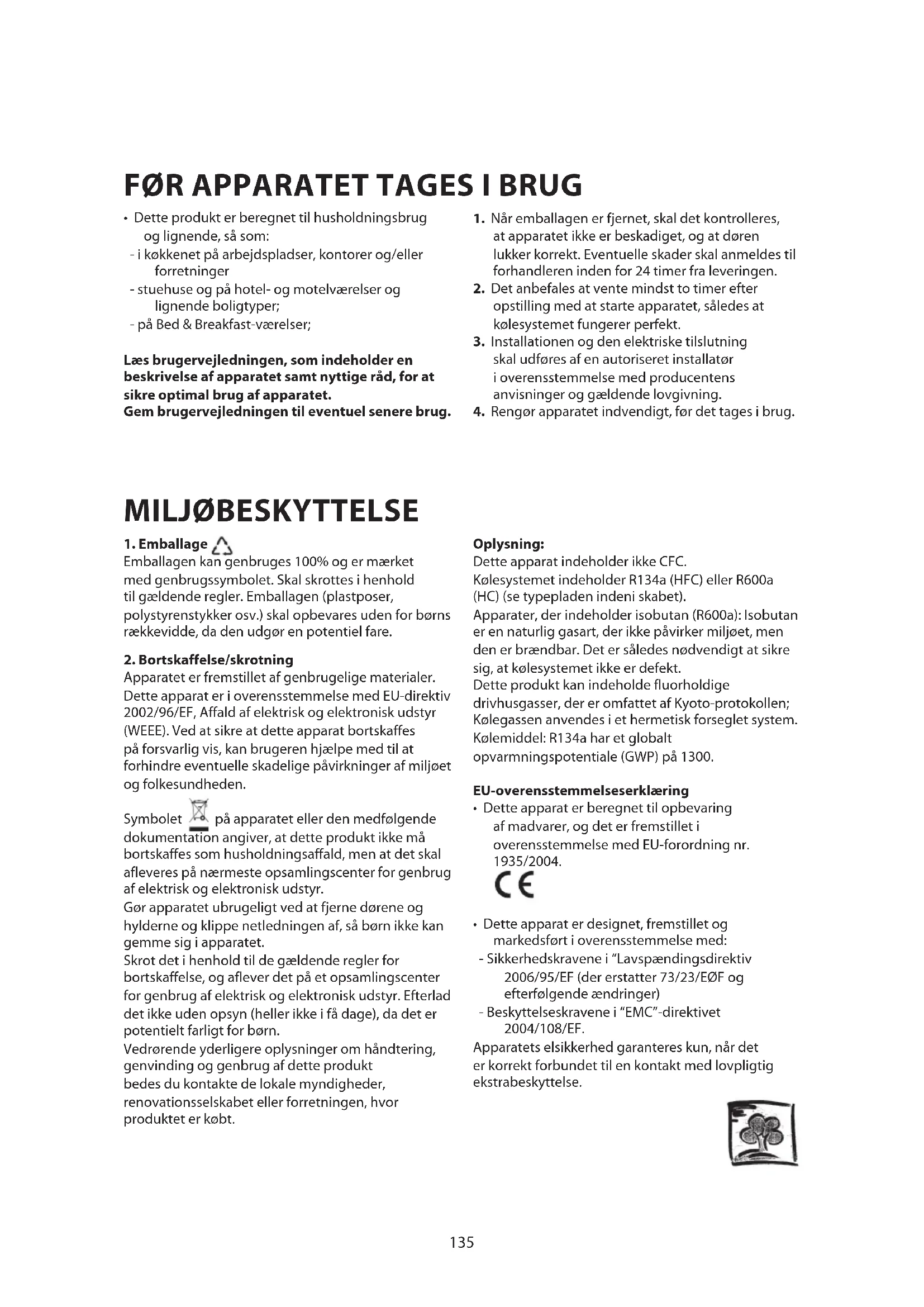 Apparatet er fremstillet af genbrugelige materialer. Dette apparat er i overensstemmelse med EU-direktiv 2002/96/EF, Affald af elektrisk og elektronisk udstyr (WEEE). Ved at sikre at dette apparat bortskaffes på forsvarlig vis, kan brugeren hjælpe med til at forhindre eventuelle skadelige påvirkninger af miljøet og folkesundheden. Symbolet på apparatet eller den medfølgende dokumentation angiver, at dette produkt ikke må bortskaffes som husholdningsaffald, men at det skal afleveres på nærmeste opsamlingscenter for genbrug af elektrisk og elektronisk udstyr. Gør apparatet ubrugeligt ved at fjerne dørene og hylderne og klippe netledningen af, så børn ikke kan gemme sig i apparatet. Skrot det i henhold til de gældende regler for bortskaffelse, og aflever det på et opsamlingscenter for genbrug af elektrisk og elektronisk udstyr. Efterlad det ikke uden opsyn (heller ikke i få dage), da det er potentielt farligt for børn. Vedrørende yderligere oplysninger om håndtering, genvinding og genbrug af dette produkt bedes du kontakte de lokale myndigheder, renovationsselskabet eller forretningen, hvor produktet er købt. Oplysning: Dette apparat indeholder ikke CFC. Kølesystemet indeholder R134a (HFC) eller R600a (HC) (se typepladen indeni skabet). Apparater, der indeholder isobutan (R600a): Isobutan er en naturlig gasart, der ikke påvirker miljøet, men den er brændbar. Det er således nødvendigt at sikre sig, at kølesystemet ikke er defekt. Dette produkt kan indeholde fluorholdige drivhusgasser, der er omfattet af Kyoto-protokollen; Kølegassen anvendes i et hermetisk forseglet system. Kølemiddel: R134a har et globalt opvarmningspotentiale (GWP) på 1300. EU-overensstemmelseserklæring